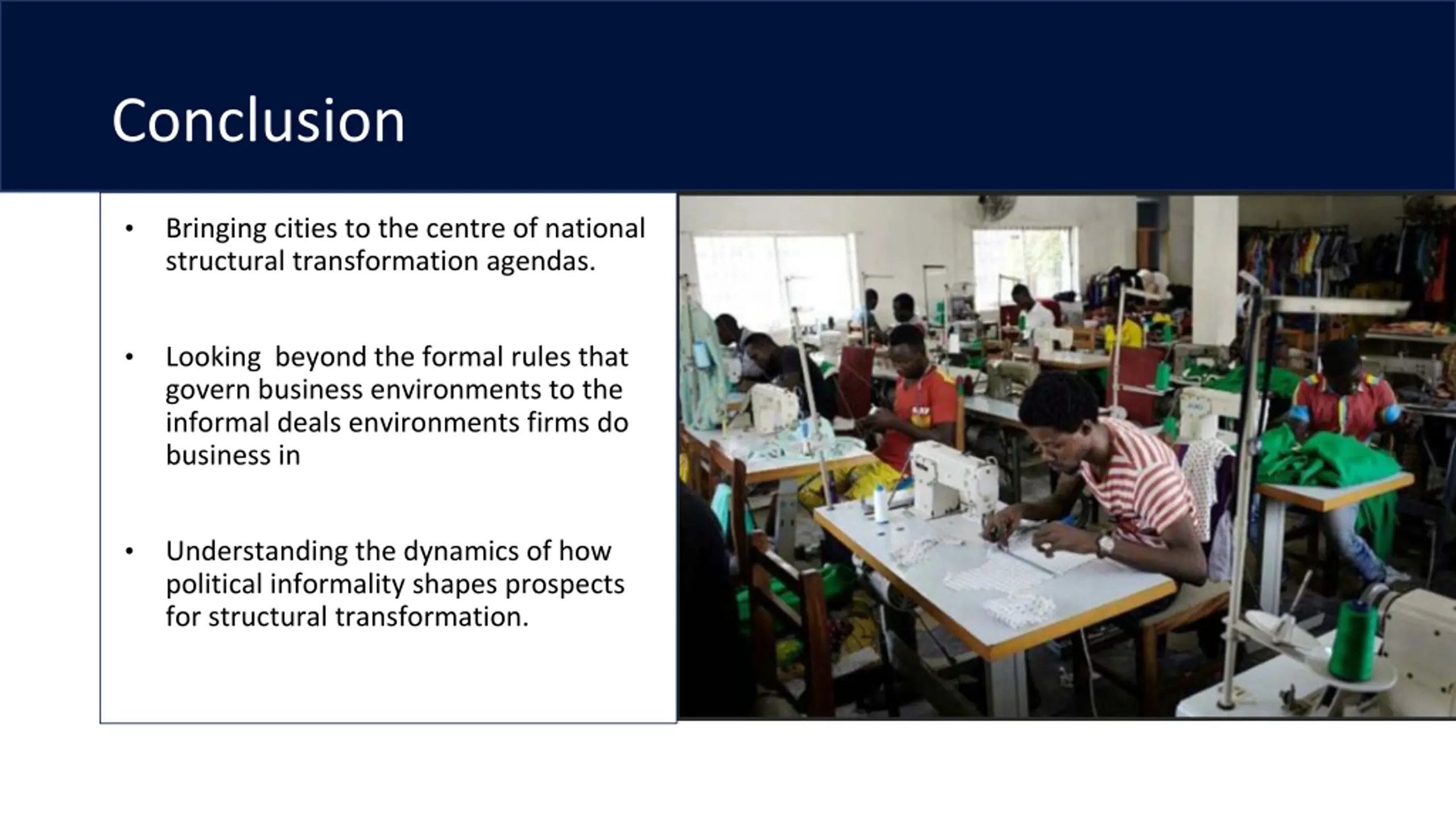 Conclusion Bringing cities to the centre of national structural transformation agendas. Looking beyond the formal rules that govern business environments to the informal deals environments firms do business in Understanding the dynamics of how political informality shapes prospects for structural transformation.