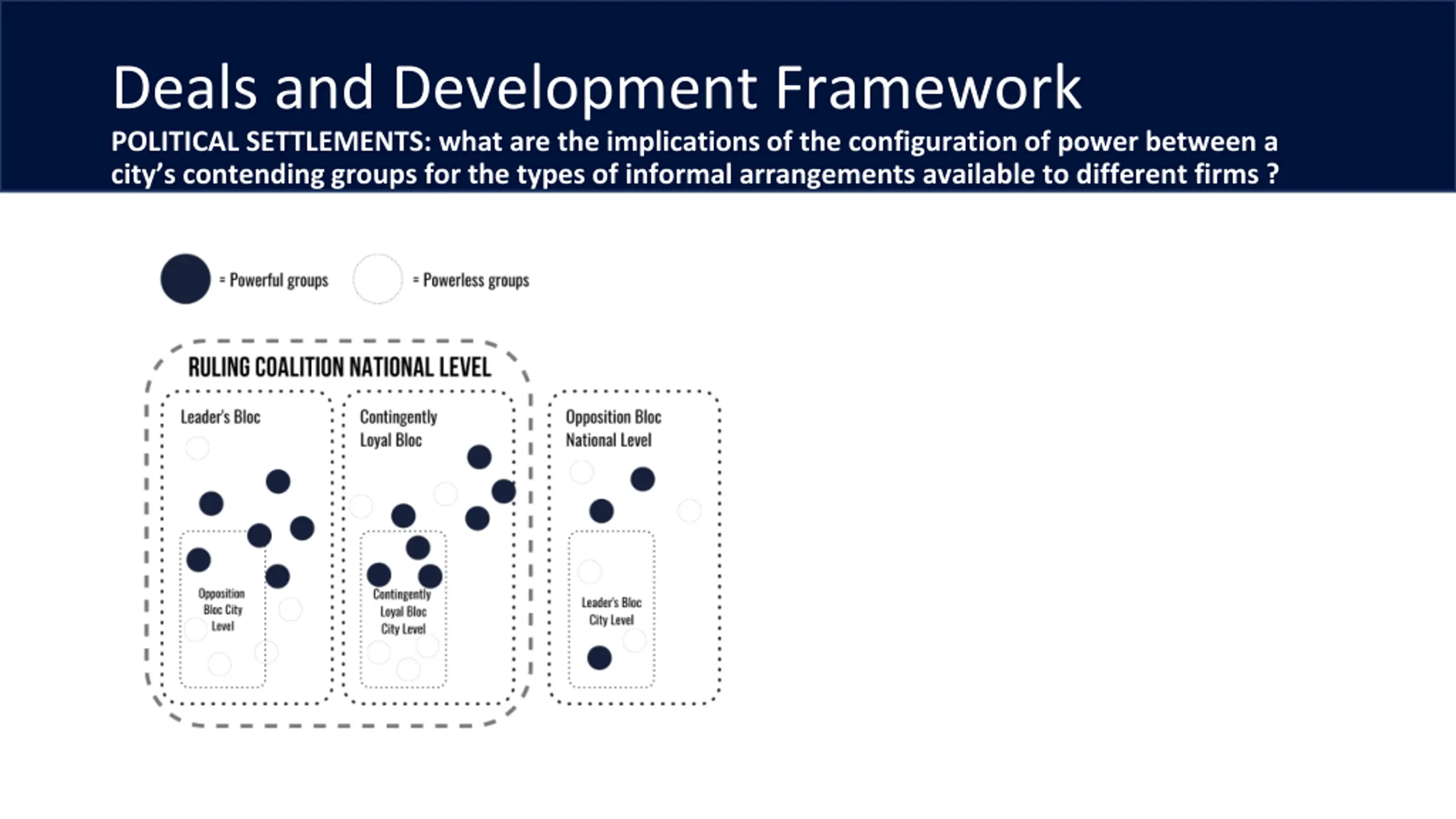 Deals and Development Framework POLITICAL SETTLEMENTS: what are the implications of the configuration of power between a city s contending groups for the types of informal arrangements available to different firms ?