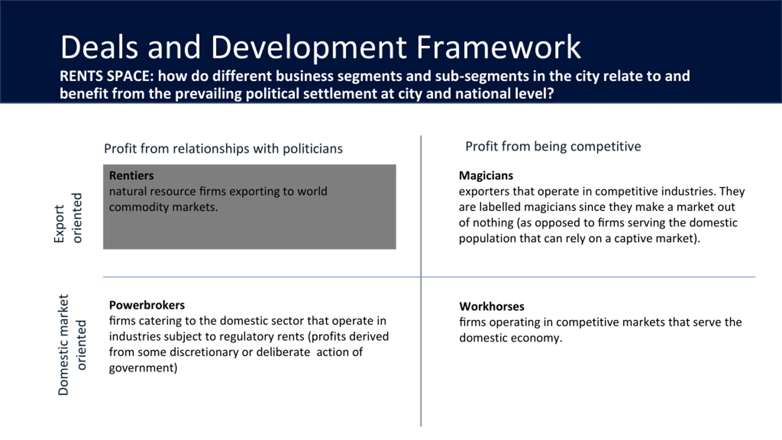 Deals and Development Framework RENTS SPACE: how do different business segments and sub-segments in the city relate to and benefit from the prevailing political settlement at city and national level? Profit from being competitive Profit from relationships with politicians Rentiers natural resource firms exporting to world commodity markets. Magicians exporters that operate in competitive industries. They are labelled magicians since they make a market out of nothing (as opposed to firms serving the domestic population that can rely on a captive market). oriented Export Domestic market Powerbrokers firms catering to the domestic sector that operate in industries subject to regulatory rents (profits derived from some discretionary or deliberate action of government) Workhorses firms operating in competitive markets that serve the domestic economy. oriented