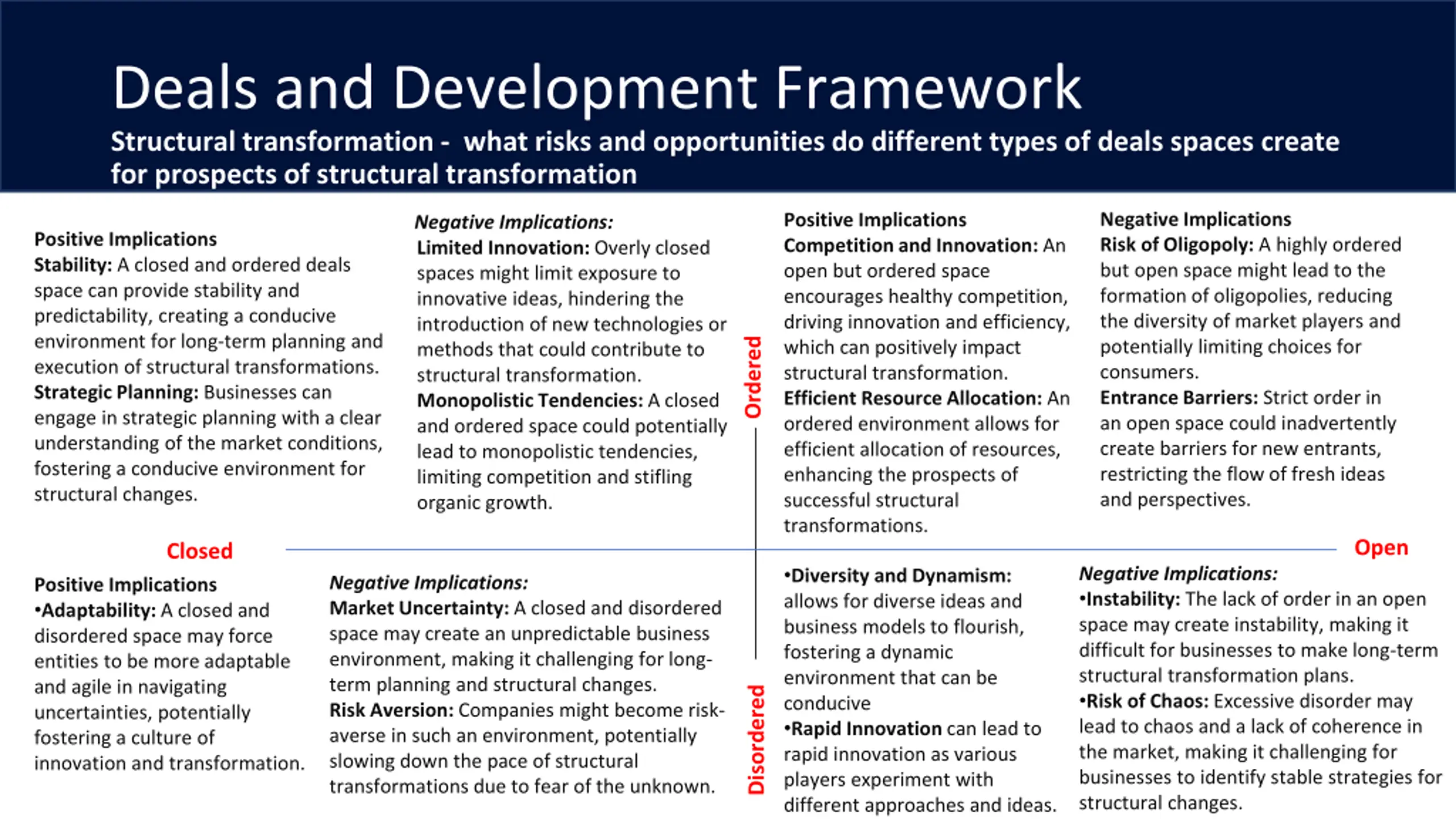 Deals and Development Framework Structural transformation - what risks and opportunities do different types of deals spaces create for prospects of structural transformation Negative Implications Risk of Oligopoly: A highly ordered but open space might lead to the formation of oligopolies, reducing the diversity of market players and potentially limiting choices for consumers. Entrance Barriers: Strict order in an open space could inadvertently create barriers for new entrants, restricting the flow of fresh ideas and perspectives. Positive Implications Competition and Innovation: An open but ordered space encourages healthy competition, driving innovation and efficiency, which can positively impact structural transformation. Efficient Resource Allocation: An ordered environment allows for efficient allocation of resources, enhancing the prospects of successful structural transformations. Negative Implications: Limited Innovation:Overly closed spaces might limit exposure to innovative ideas, hindering the introduction of new technologies or methods that could contribute to structural transformation. Monopolistic Tendencies: A closed and ordered space could potentially lead to monopolistic tendencies, limiting competition and stifling organic growth. Positive Implications Stability: A closed and ordered deals space can provide stability and predictability, creating a conducive environment for long-term planning and execution of structural transformations. Strategic Planning: Businesses can engage in strategic planning with a clear understanding of the market conditions, fostering a conducive environment for structural changes. Ordered Open Closed Diversity and Dynamism: allows for diverse ideas and business models to flourish, fostering a dynamic environment that can be conducive Rapid Innovation can lead to rapid innovation as various players experiment with different approaches and ideas. Negative Implications: Instability: The lack of order in an open space may create instability, making it difficult for businesses to make long-term structural transformation plans. Risk of Chaos: Excessive disorder may lead to chaos and a lack of coherence in the market, making it challenging for businesses to identify stable strategies for structural changes. Negative Implications: Market Uncertainty: A closed and disordered space may create an unpredictable business environment, making it challenging for long- term planning and structural changes. Risk Aversion: Companies might become risk- averse in such an environment, potentially slowing down the pace of structural transformations due to fear of the unknown. Positive Implications Adaptability:A closed and disordered space may force entities to be more adaptable and agile in navigating uncertainties, potentially fostering a culture of innovation and transformation. Disordered