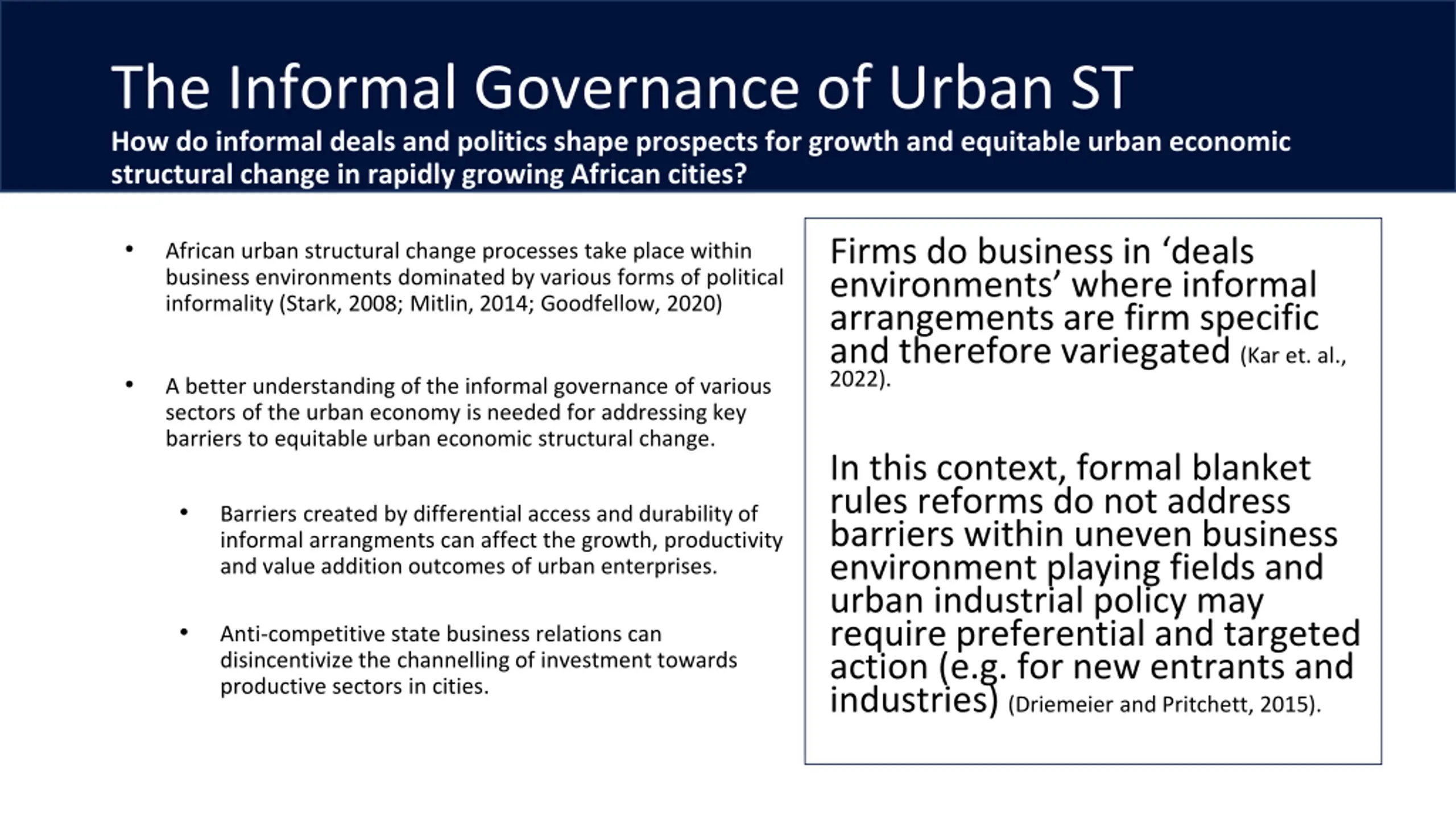 The Informal Governance of Urban ST How do informal deals and politics shape prospects for growth and equitable urban economic structural change in rapidly growing African cities? Firms do business in deals environments where informal arrangements are firm specific and therefore variegated (Kar et. al., 2022). African urban structural change processes take place within business environments dominated by various forms of political informality (Stark, 2008; Mitlin, 2014; Goodfellow, 2020) A better understanding of the informal governance of various sectors of the urban economy is needed for addressing key barriers to equitable urban economic structural change. In this context, formal blanket rules reforms do not address barriers within uneven business environment playing fields and urban industrial policy may require preferential and targeted action (e.g. for new entrants and industries) (Driemeier and Pritchett, 2015). Barriers created by differential access and durability of informal arrangments can affect the growth, productivity and value addition outcomes of urban enterprises. Anti-competitive state business relations can disincentivize the channelling of investment towards productive sectors in cities.
