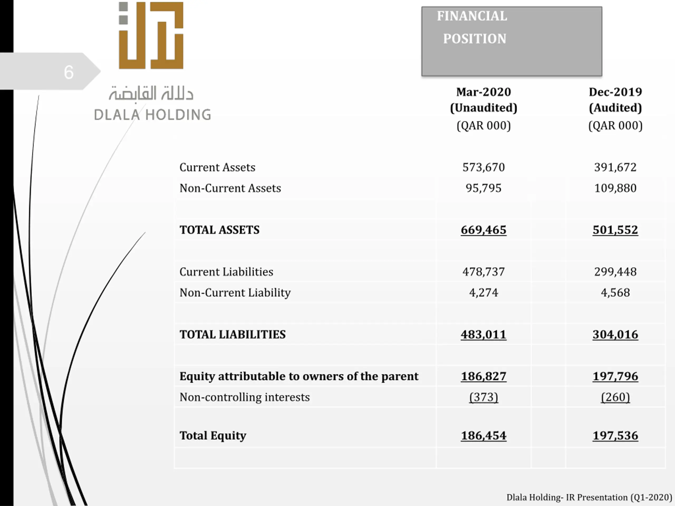 FINANCIAL POSITION 6 Mar-2020 (Unaudited) (QAR 000) Dec-2019 (Audited) (QAR 000) Current Assets 573,670 391,672 Non-Current Assets 95,795 109,880 TOTAL ASSETS 669,465 501,552 Current Liabilities 478,737 299,448 Non-Current Liability 4,274 4,568 TOTAL LIABILITIES 483,011 304,016 Equity attributable to owners of the parent 186,827 197,796 Non-controlling interests (373) (260) Total Equity 186,454 197,536 Dlala Holding- IR Presentation (Q1-2020)