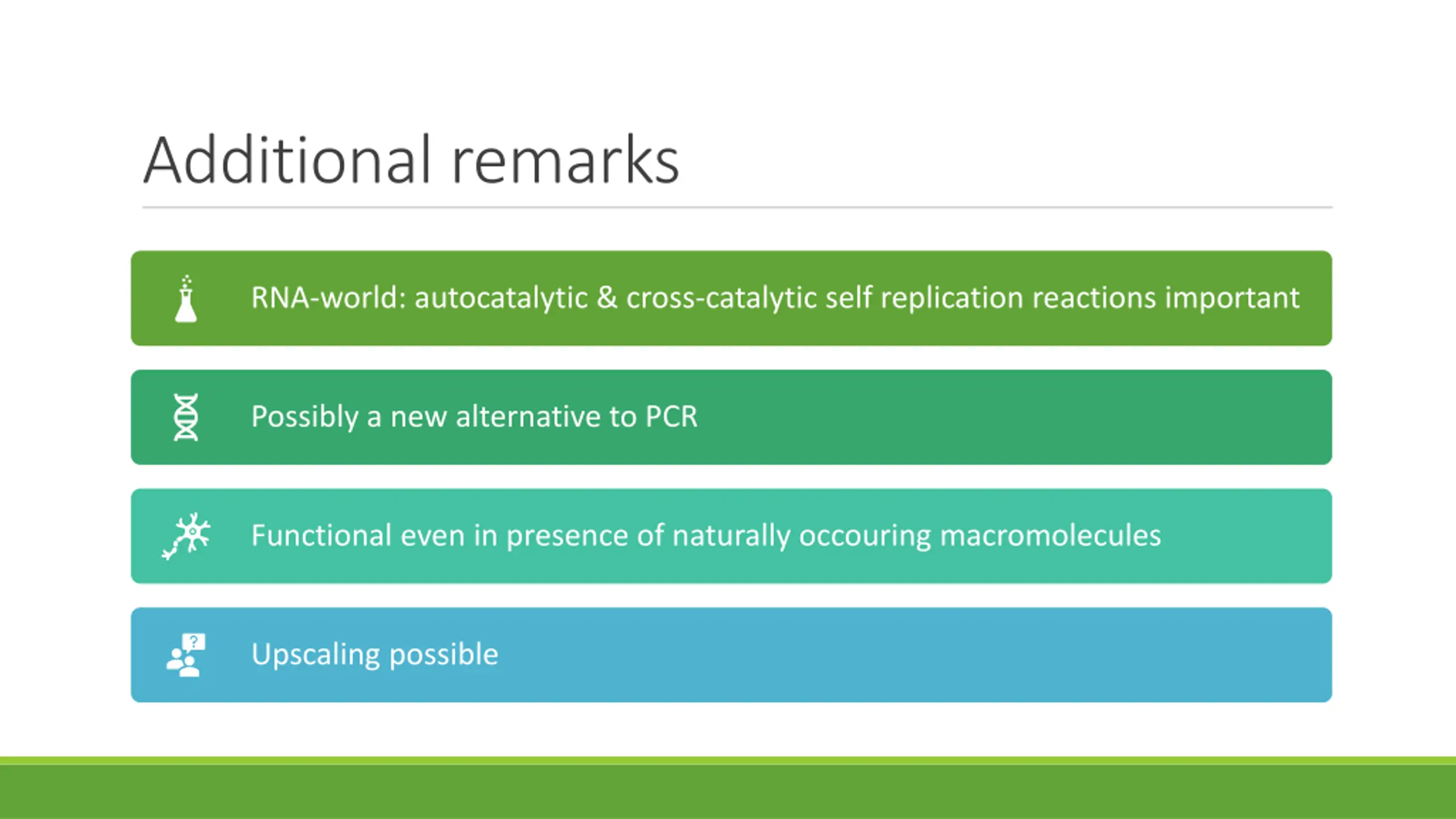 Additional remarks RNA-world: autocatalytic & cross-catalytic self replication reactions important Possibly a new alternative to PCR Functional even in presence of naturally occouring macromolecules Upscaling possible