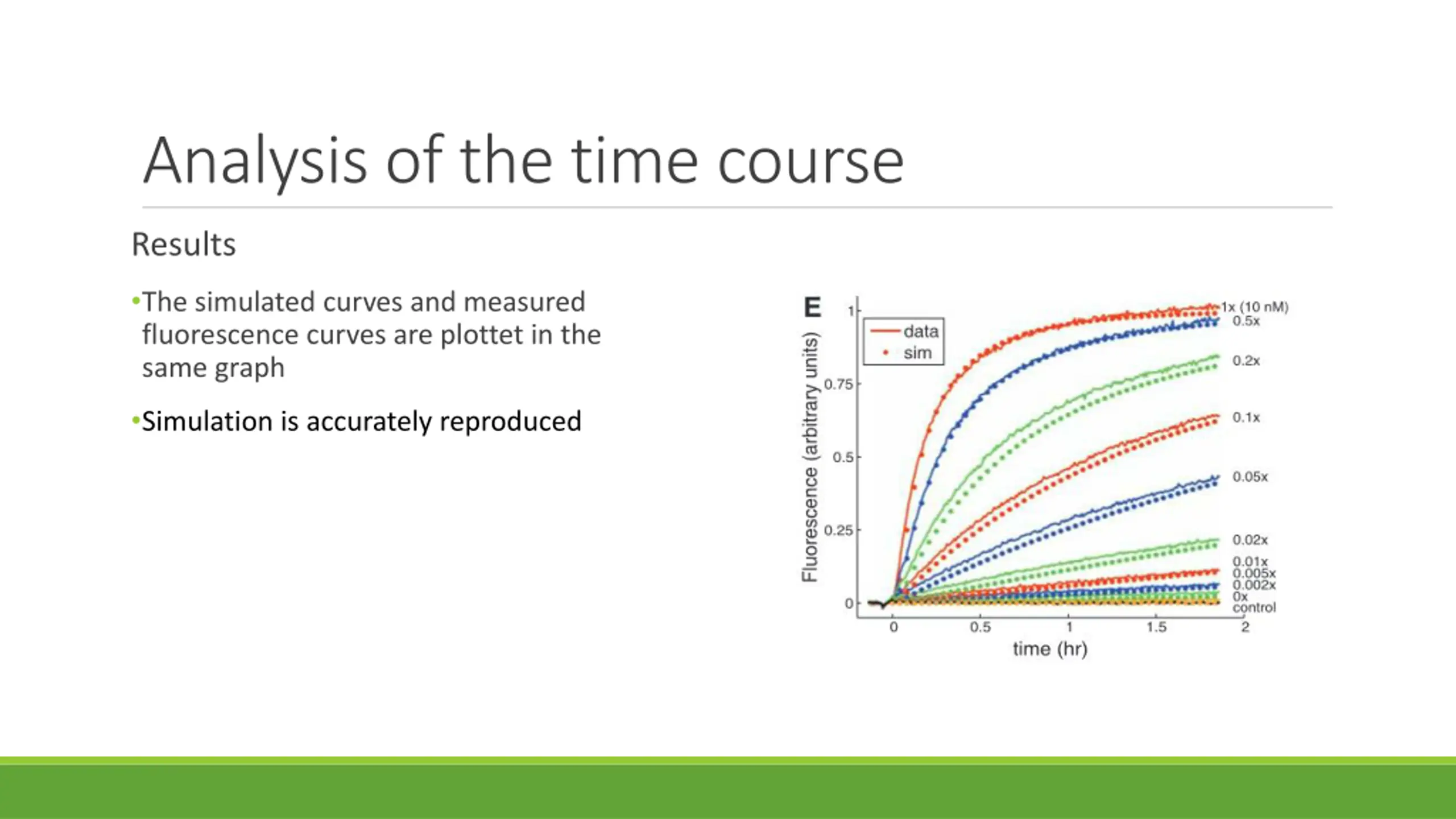 Analysis of the time course Results The simulated curves and measured fluorescence curves are plottet in the same graph Simulation is accurately reproduced