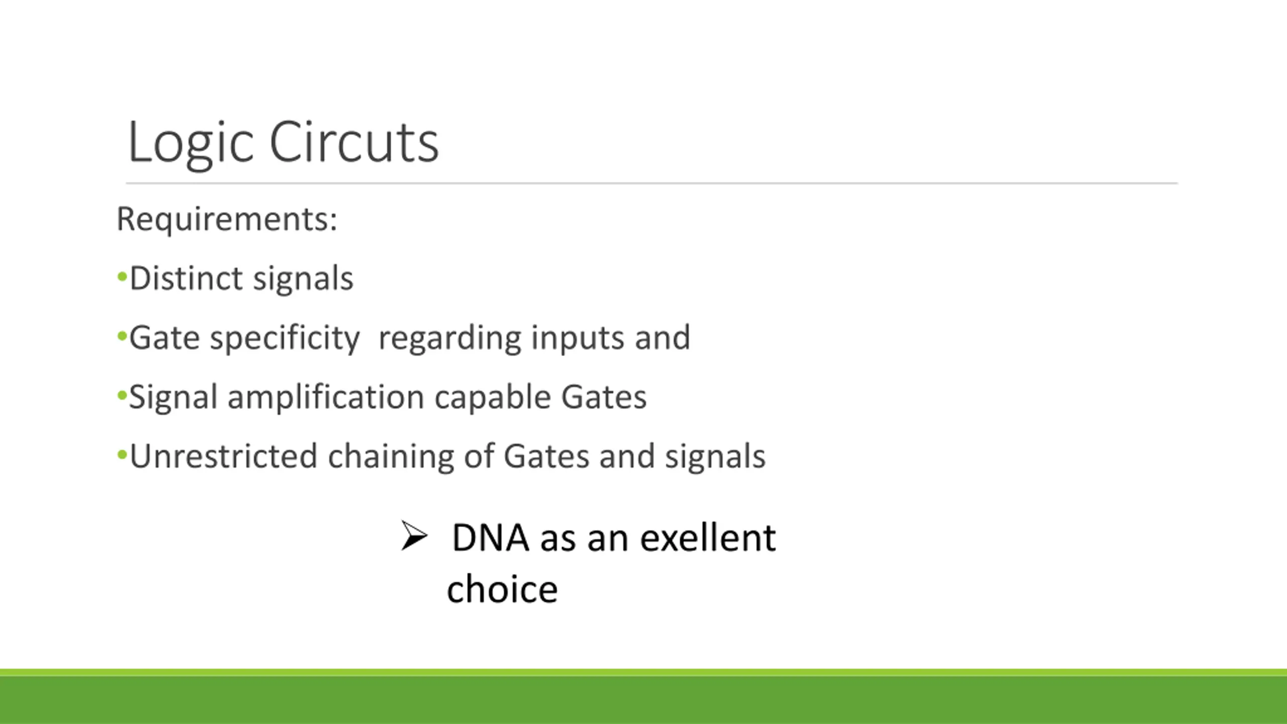 Logic Circuts Requirements: Distinct signals Gate specificity regarding inputs and Signal amplification capable Gates Unrestricted chaining of Gates and signals DNA as an exellent choice