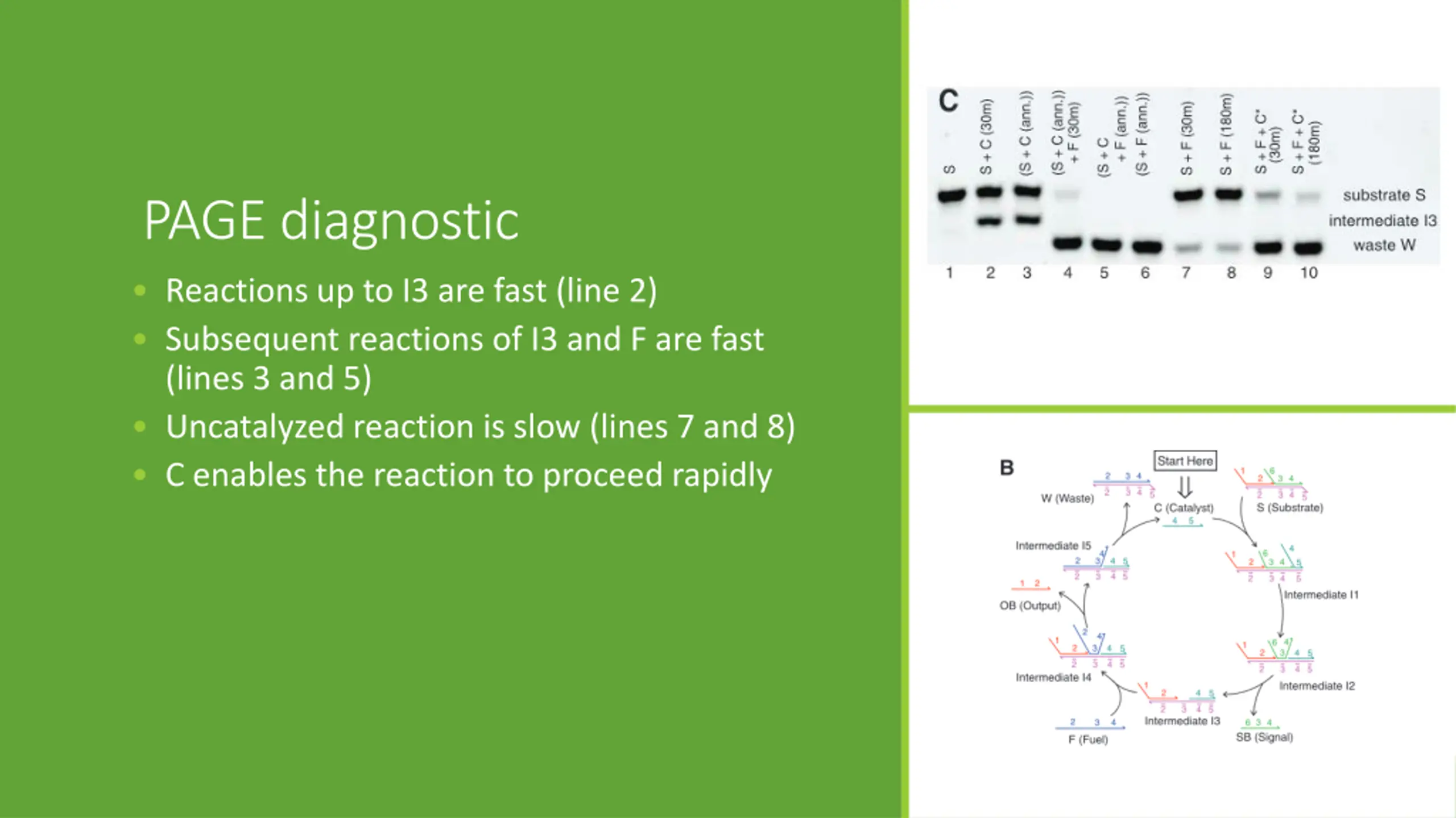 PAGE diagnostic Reactions up to I3 are fast (line 2) Subsequent reactions of I3 and F are fast (lines 3 and 5) Uncatalyzed reaction is slow (lines 7 and 8) C enables the reaction to proceed rapidly