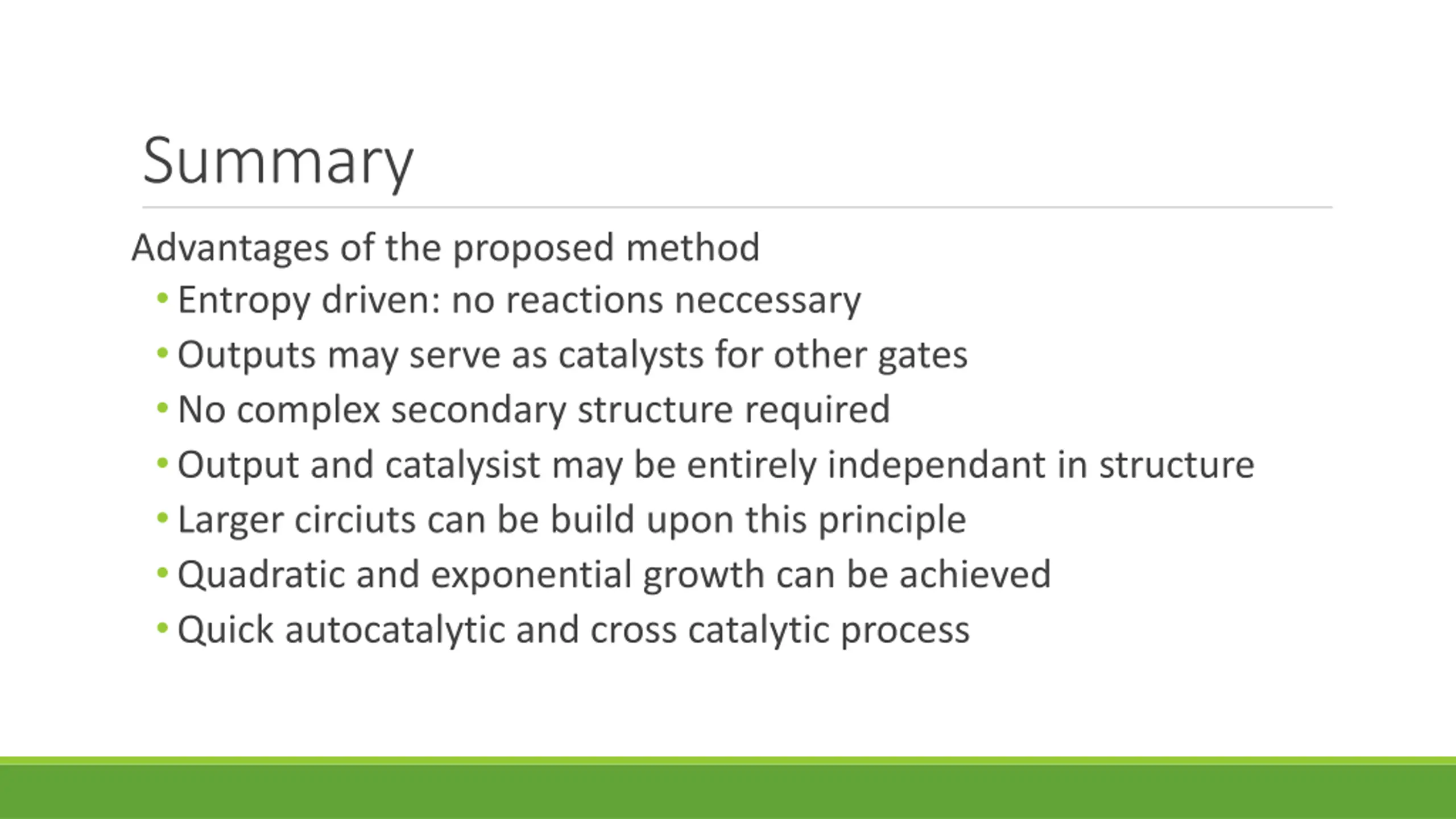 Summary Advantages of the proposed method Entropy driven: no reactions neccessary Outputs may serve as catalysts for other gates No complex secondary structure required Output and catalysist may be entirely independant in structure Larger circiuts can be build upon this principle Quadratic and exponential growth can be achieved Quick autocatalytic and cross catalytic process
