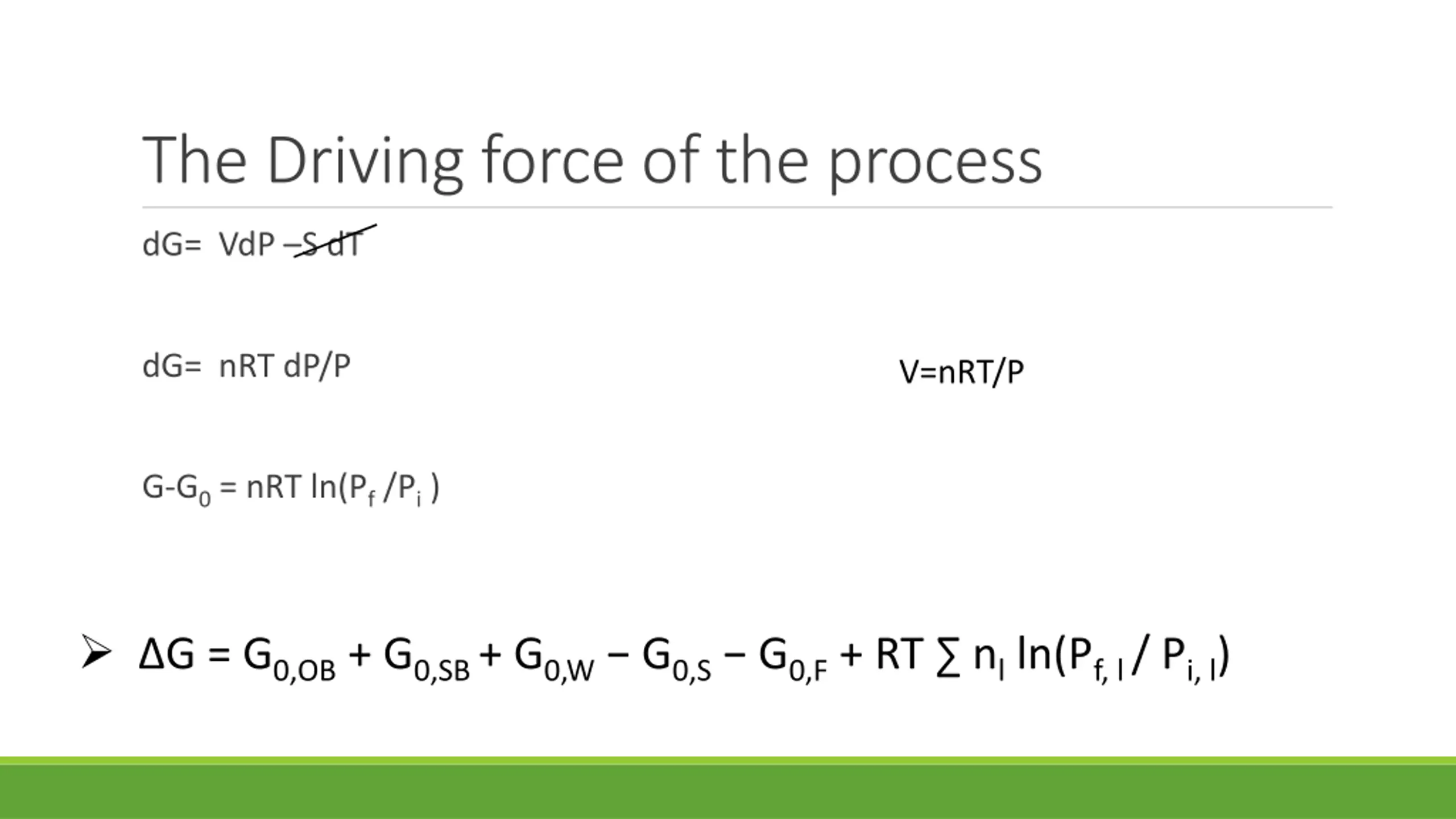 The Driving force of the process dG= VdP S dT dG= nRT dP/P V=nRT/P G-G0= nRT ln(Pf/Pi) G = G0,OB+ G0,SB + G0,W G0,S G0,F+ RT nl ln(Pf, l / Pi, l)