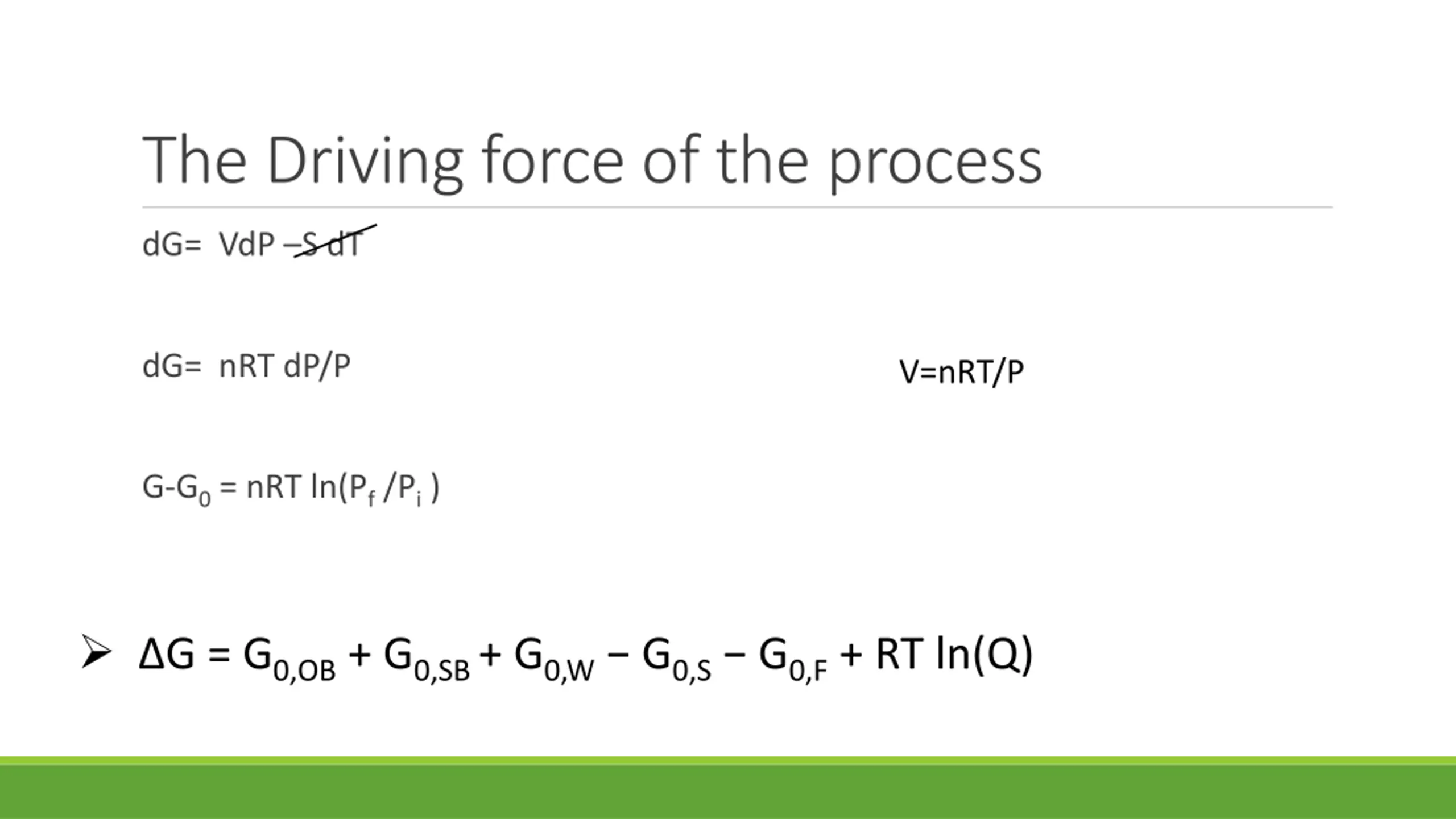 The Driving force of the process dG= VdP S dT dG= nRT dP/P V=nRT/P G-G0= nRT ln(Pf/Pi) G = G0,OB+ G0,SB + G0,W G0,S G0,F+ RT ln(Q)