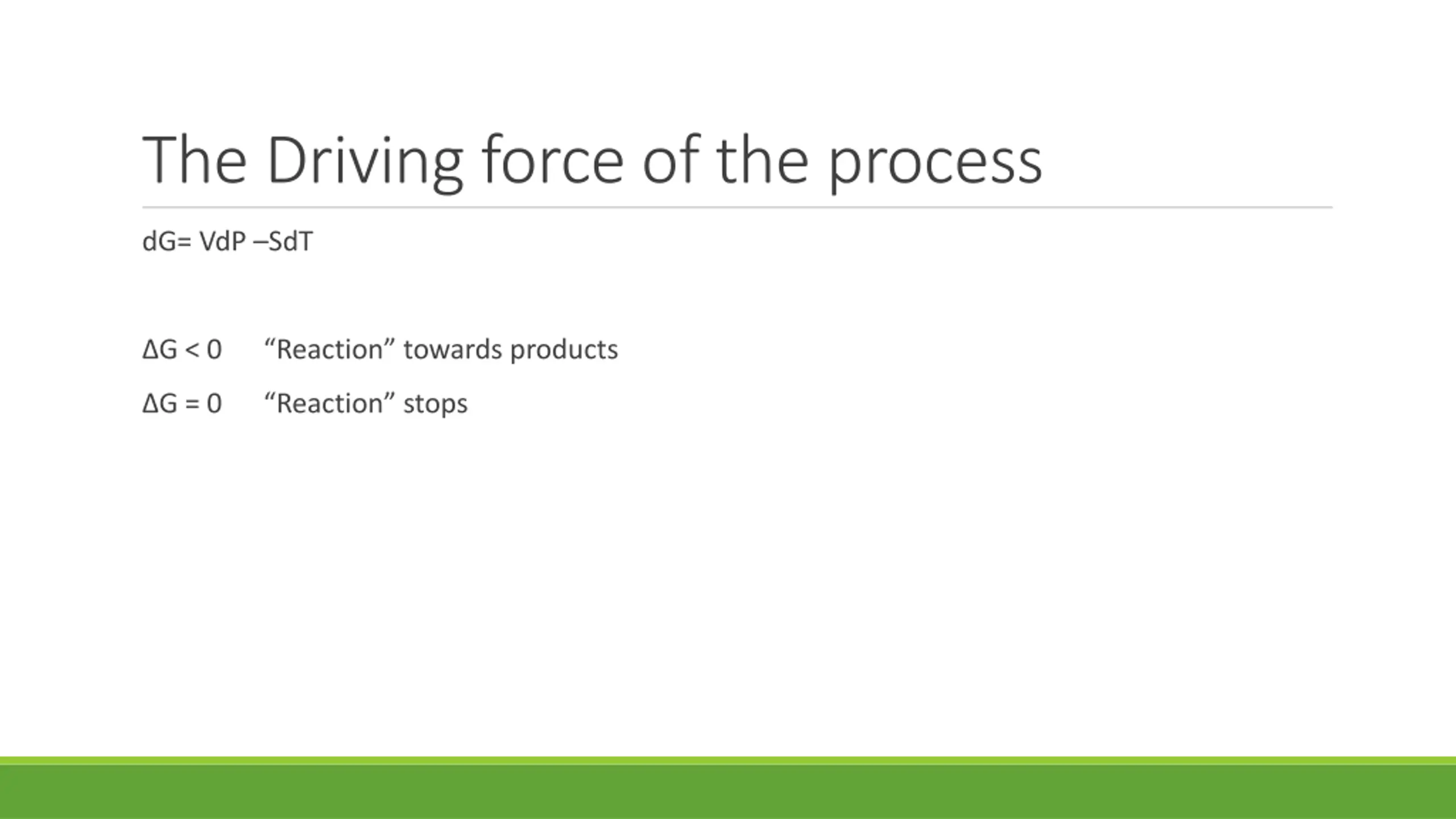 The Driving force of the process dG= VdP SdT G < 0 Reaction towards products G = 0 Reaction stops