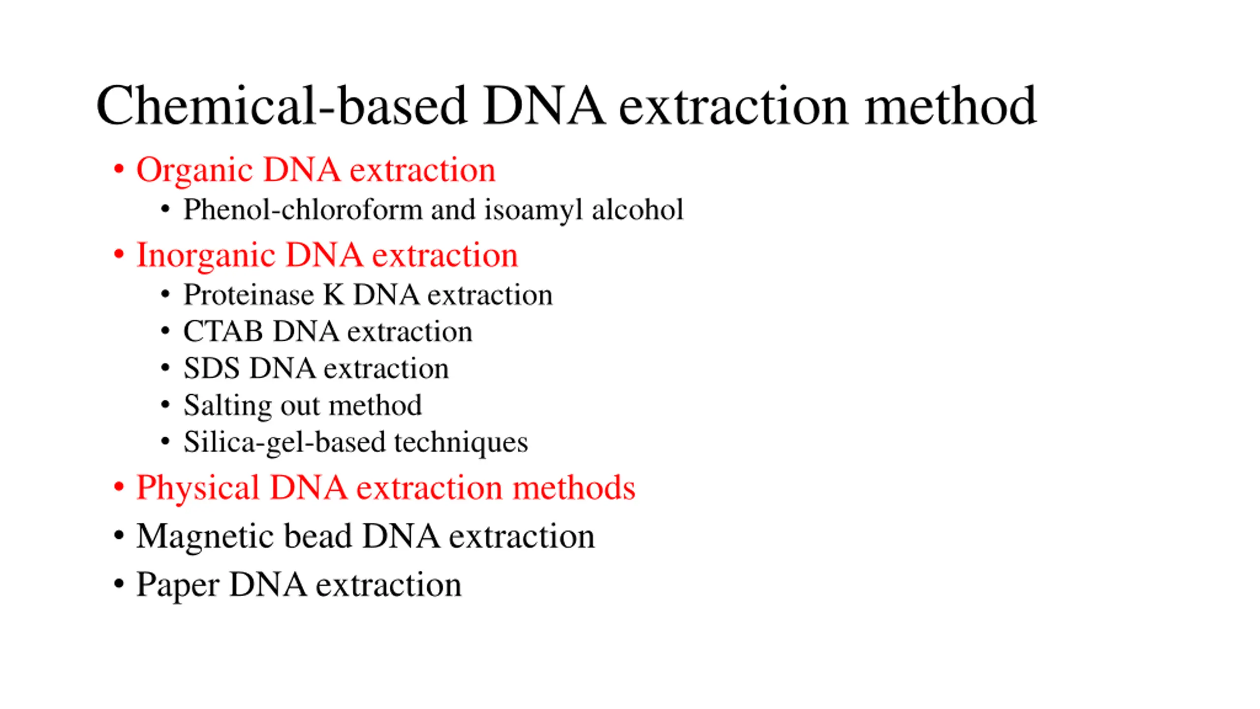 Chemical-based DNA extraction method Organic DNA extraction Phenol-chloroform and isoamyl alcohol Inorganic DNA extraction Proteinase K DNA extraction CTAB DNA extraction SDS DNA extraction Salting out method Silica-gel-based techniques Physical DNA extraction methods Magnetic bead DNA extraction Paper DNA extraction
