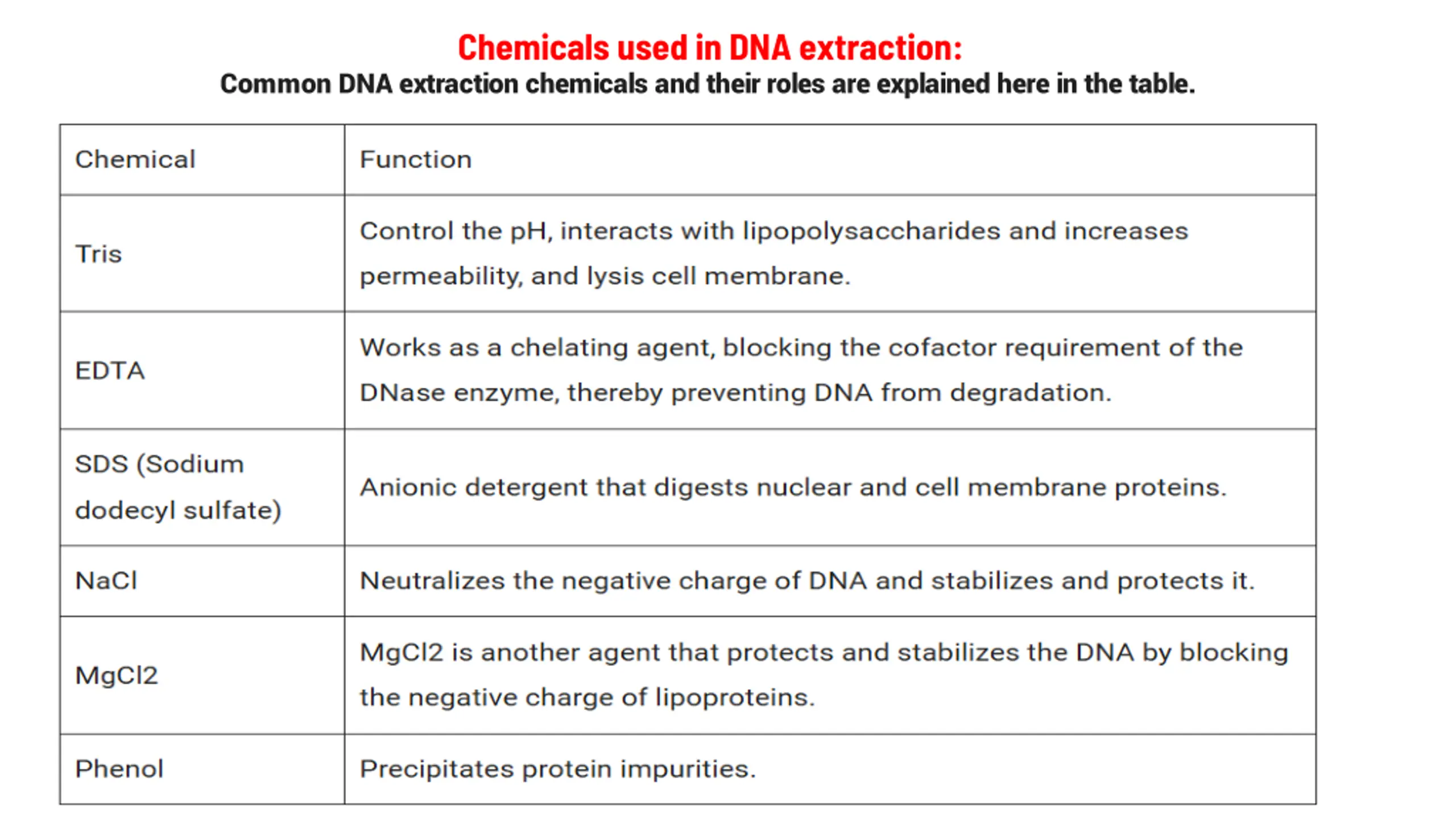 Chemicals used in DNA extraction: Common DNA extraction chemicals and their roles are explained here in the table.