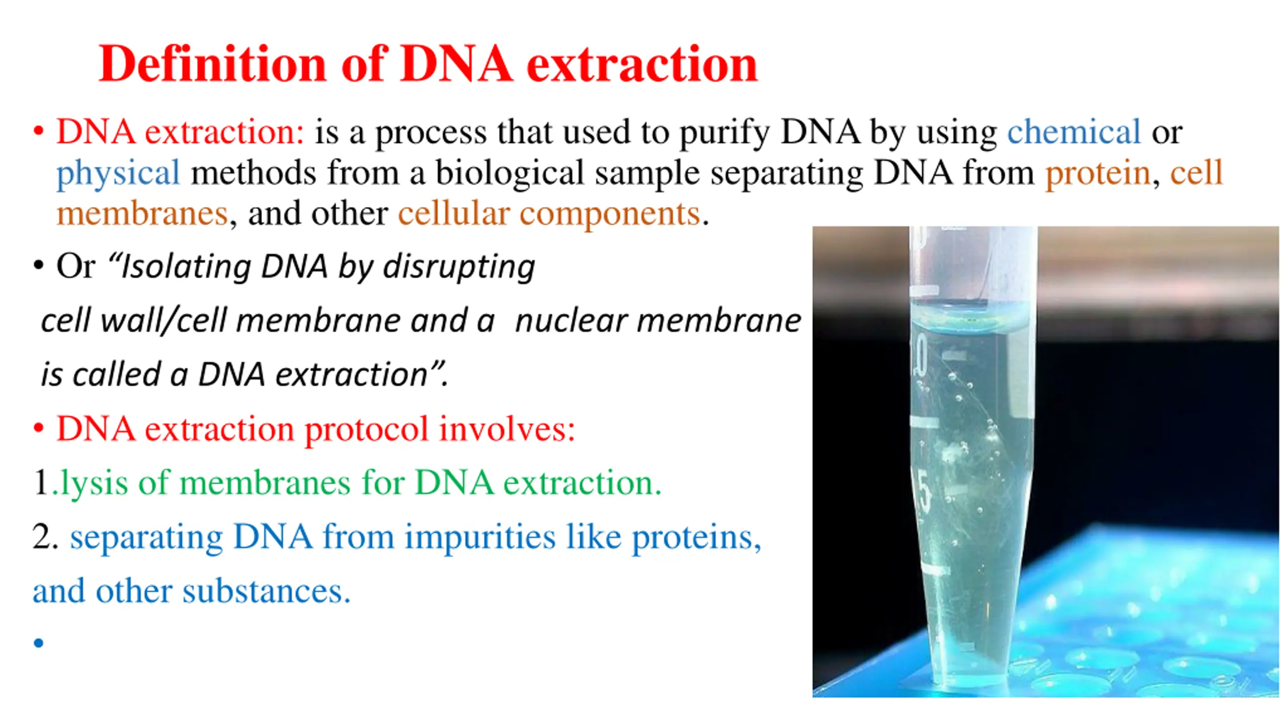 Definition of DNA extraction DNA extraction: is a process that used to purify DNA by using chemical or physical methods from a biological sample separating DNA from protein, cell membranes, and other cellular components. Or Isolating DNA by disrupting cell wall/cell membrane and a nuclear membrane is called a DNA extraction . DNA extraction protocol involves: 1.lysis of membranes for DNA extraction. 2. separating DNA from impurities like proteins, and other substances.