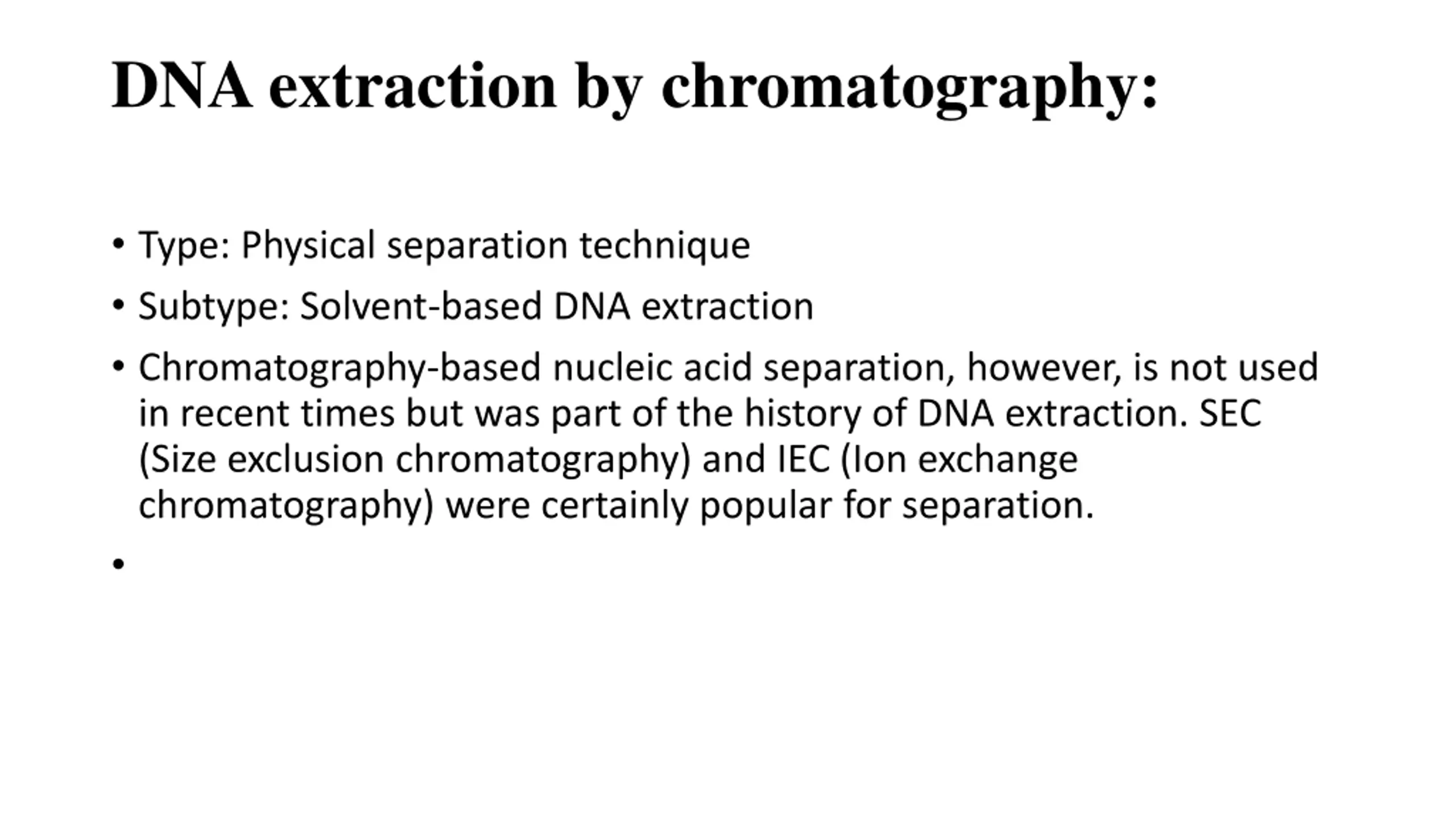 DNA extraction by chromatography: Type: Physical separation technique Subtype: Solvent-based DNA extraction Chromatography-based nucleic acid separation, however, is not used in recent times but was part of the history of DNA extraction. SEC (Size exclusion chromatography) and IEC (Ion exchange chromatography) were certainly popular for separation.
