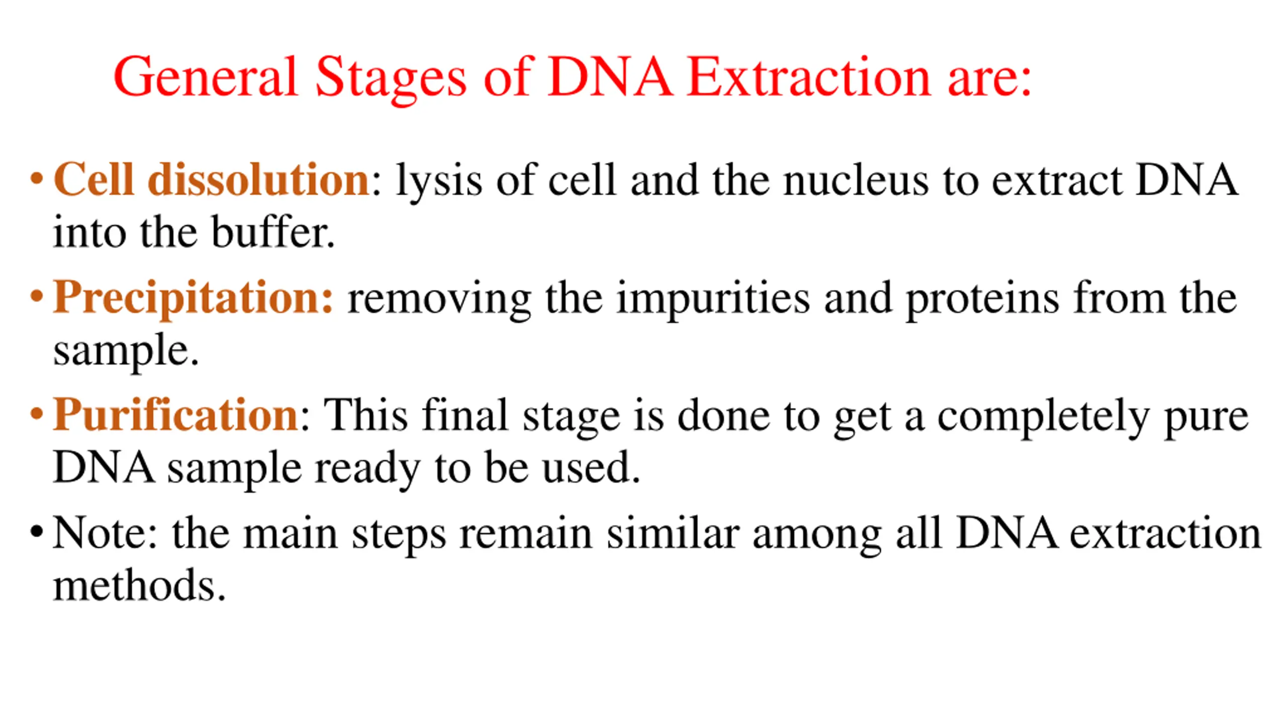 General Stages of DNA Extraction are: Cell dissolution: lysis of cell and the nucleus to extract DNA into the buffer. Precipitation: removing the impurities and proteins from the sample. Purification: This final stage is done to get a completely pure DNA sample ready to be used. Note: the main steps remain similar among all DNA extraction methods.