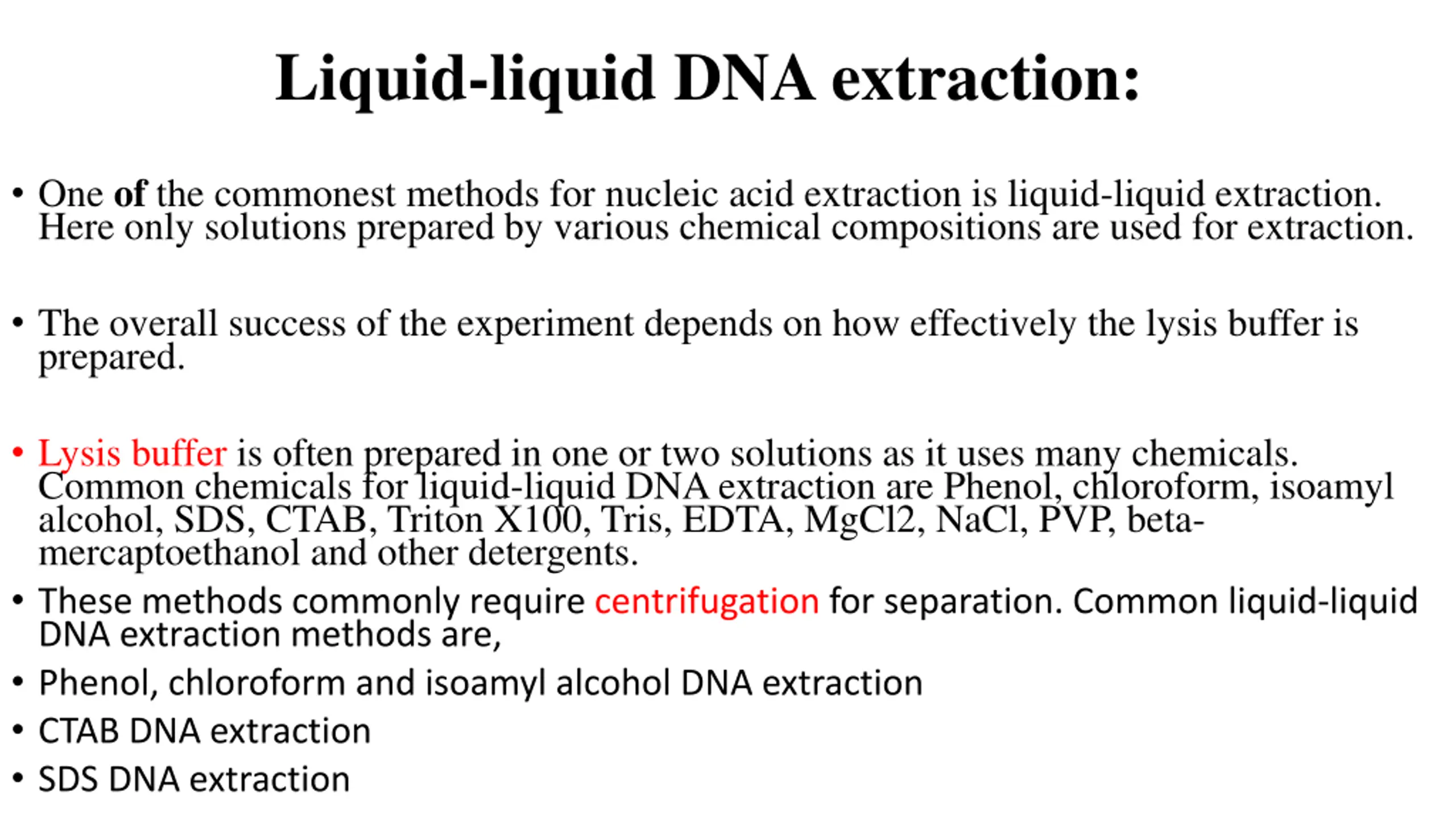 Liquid-liquid DNA extraction: One of the commonest methods for nucleic acid extraction is liquid-liquid extraction. Here only solutions prepared by various chemical compositions are used for extraction. The overall success of the experiment depends on how effectively the lysis buffer is prepared. Lysis buffer is often prepared in one or two solutions as it uses many chemicals. Common chemicals for liquid-liquid DNA extraction are Phenol, chloroform, isoamyl alcohol, SDS, CTAB, Triton X100, Tris, EDTA, MgCl2, NaCl, PVP, beta- mercaptoethanol and other detergents. These methods commonly require centrifugation for separation. Common liquid-liquid DNA extraction methods are, Phenol, chloroform and isoamyl alcohol DNA extraction CTAB DNA extraction SDS DNA extraction