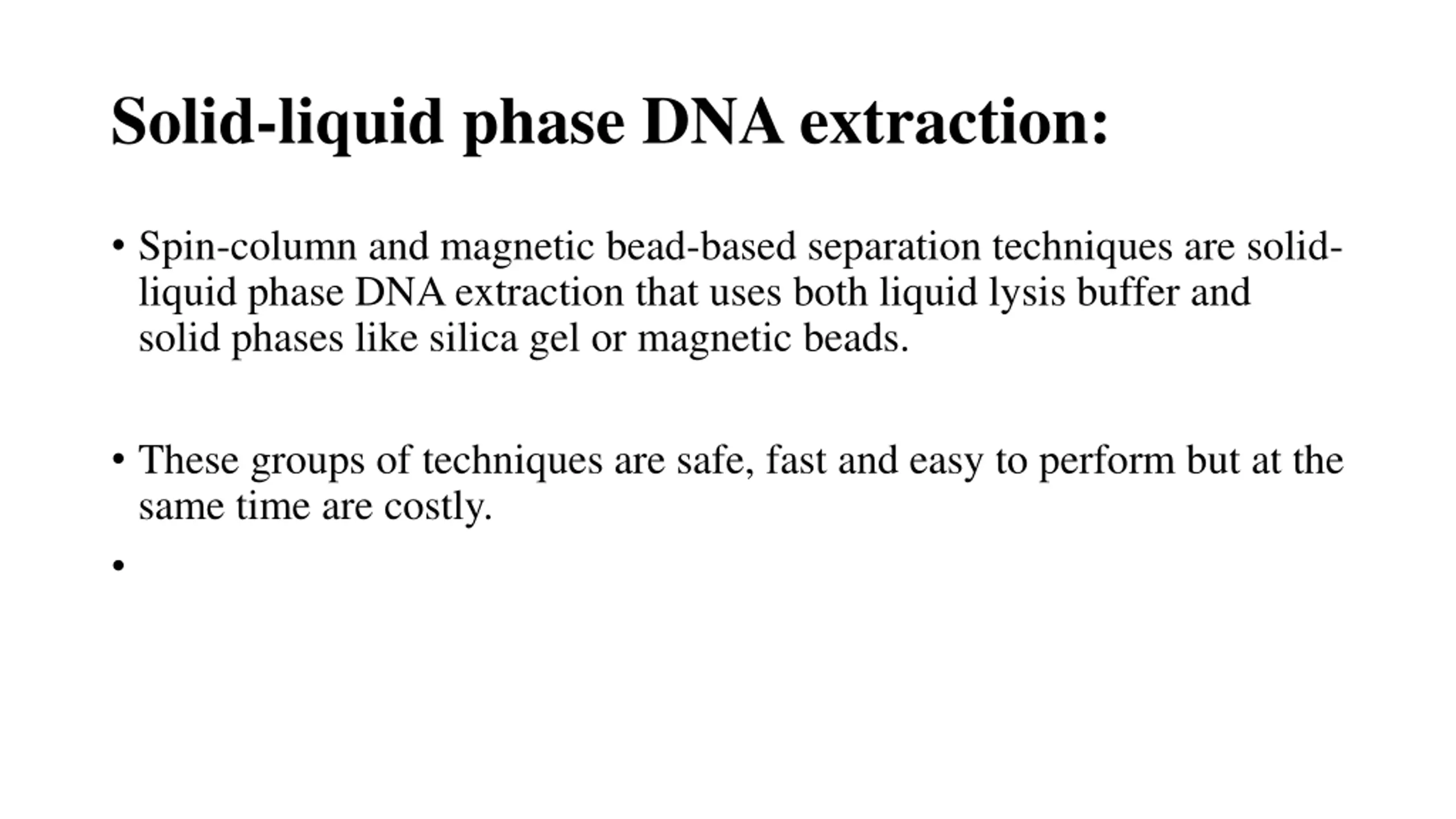 Solid-liquid phase DNA extraction: Spin-column and magnetic bead-based separation techniques are solid- liquid phase DNA extraction that uses both liquid lysis buffer and solid phases like silica gel or magnetic beads. These groups of techniques are safe, fast and easy to perform but at the same time are costly.