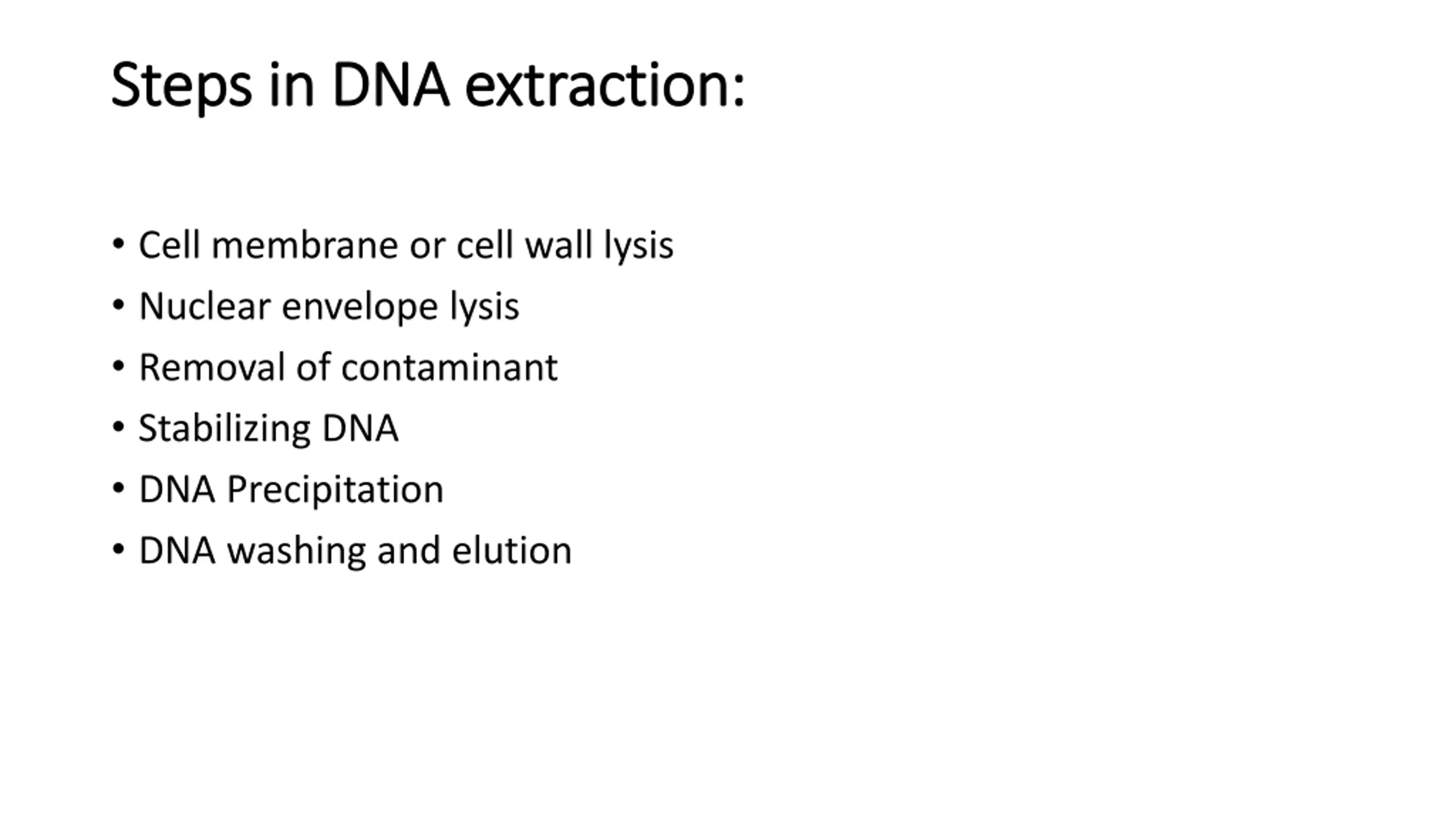Steps in DNA extraction: Steps in DNA extraction: Cell membrane or cell wall lysis Nuclear envelope lysis Removal of contaminant Stabilizing DNA DNA Precipitation DNA washing and elution