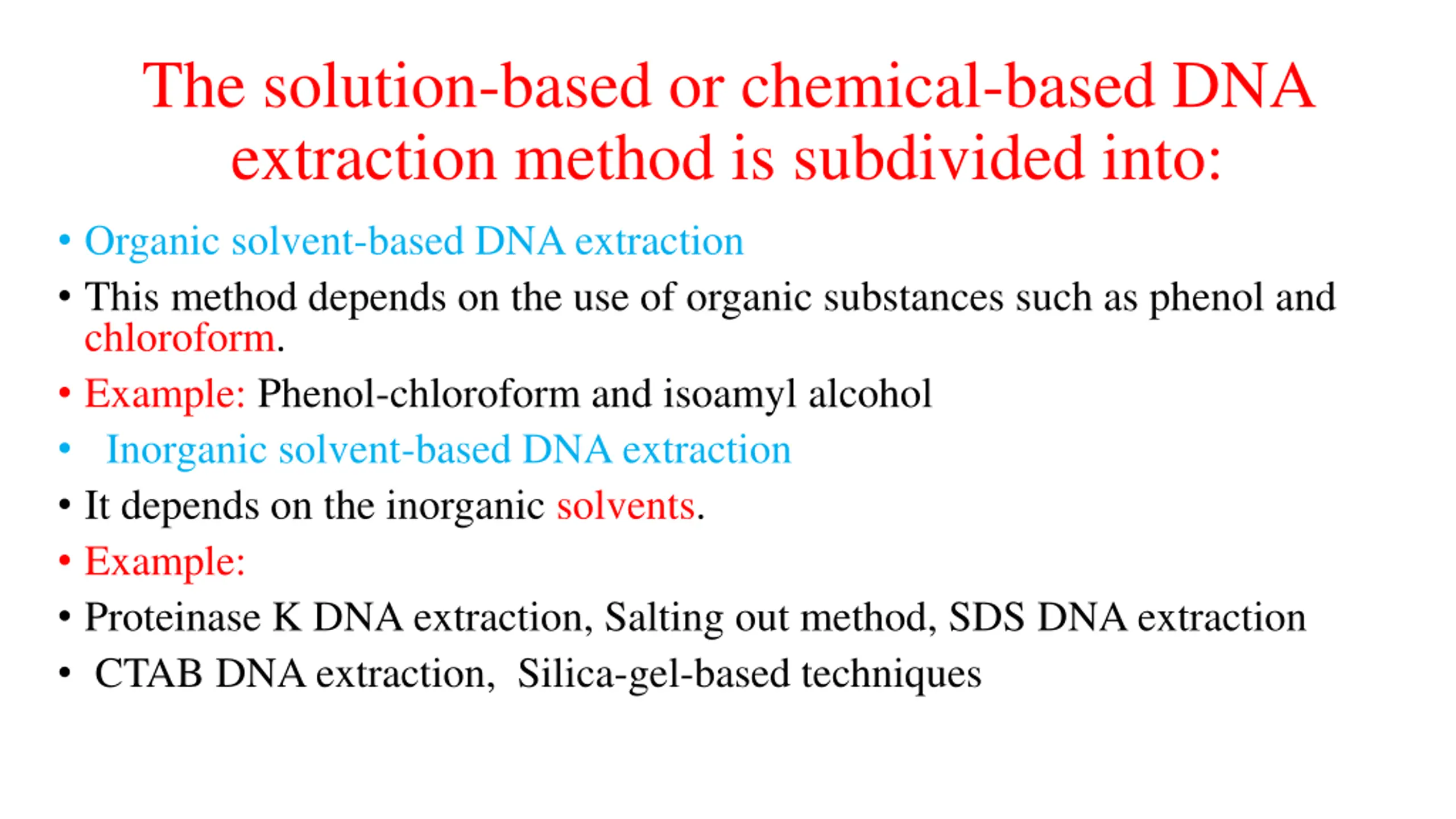 The solution-based or chemical-based DNA extraction method is subdivided into: Organic solvent-based DNA extraction This method depends on the use of organic substances such as phenol and chloroform. Example: Phenol-chloroform and isoamyl alcohol Inorganic solvent-based DNA extraction It depends on the inorganic solvents. Example: Proteinase K DNA extraction, Salting out method, SDS DNA extraction CTAB DNA extraction, Silica-gel-based techniques