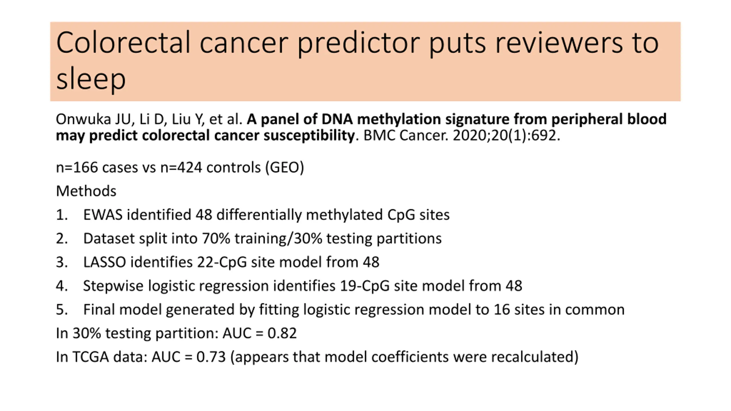 Colorectal cancer predictor puts reviewers to sleep Onwuka JU, Li D, Liu Y, et al. A panel of DNA methylation signature from peripheral blood may predict colorectal cancer susceptibility. BMC Cancer. 2020;20(1):692. n=166 cases vs n=424 controls (GEO) Methods 1. EWAS identified 48 differentially methylated CpG sites 2. Dataset split into 70% training/30% testing partitions 3. LASSO identifies 22-CpG site model from 48 4. Stepwise logistic regression identifies 19-CpG site model from 48 5. Final model generated by fitting logistic regression model to 16 sites in common In 30% testing partition: AUC = 0.82 In TCGA data: AUC = 0.73 (appears that model coefficients were recalculated)