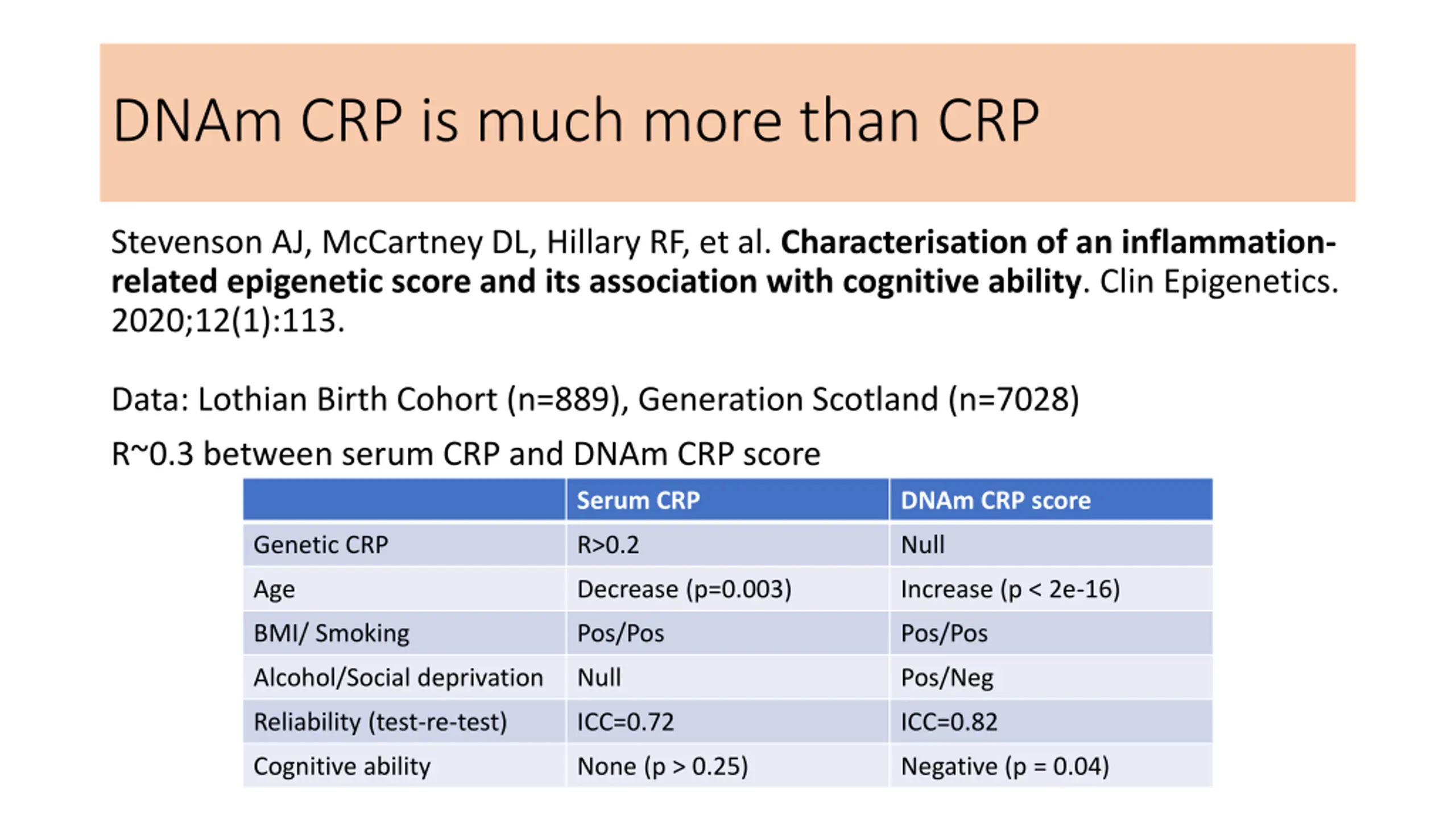 DNAm CRP is much more than CRP Stevenson AJ, McCartney DL, Hillary RF, et al. Characterisation of an inflammation- related epigenetic score and its association with cognitive ability. Clin Epigenetics. 2020;12(1):113. Data: Lothian Birth Cohort (n=889), Generation Scotland (n=7028) R~0.3 between serum CRP and DNAm CRP score Serum CRP DNAm CRP score Genetic CRP R>0.2 Null Age Decrease (p=0.003) Increase (p < 2e-16) BMI/ Smoking Pos/Pos Pos/Pos Alcohol/Social deprivation Null Pos/Neg Reliability (test-re-test) ICC=0.72 ICC=0.82 Cognitive ability None (p > 0.25) Negative (p = 0.04)