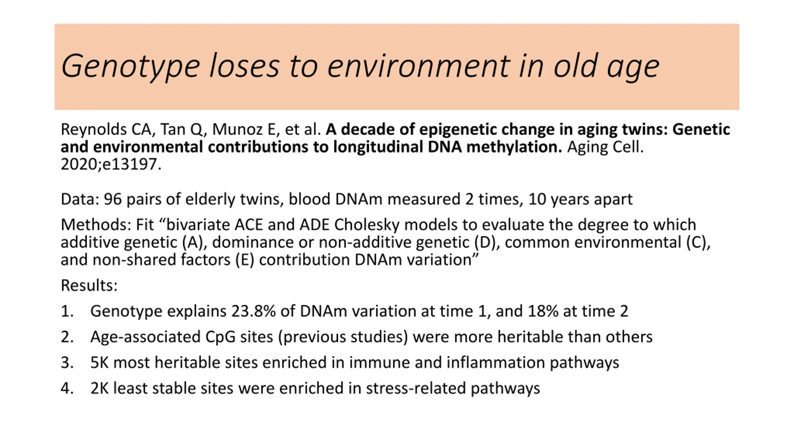 Genotype loses to environment in old age Reynolds CA, Tan Q, Munoz E, et al. A decade of epigenetic change in aging twins: Genetic and environmental contributions to longitudinal DNA methylation. Aging Cell. 2020;e13197. Data: 96 pairs of elderly twins, blood DNAm measured 2 times, 10 years apart Methods: Fit bivariate ACE and ADE Cholesky models to evaluate the degree to which additive genetic (A), dominance or non additive genetic (D), common environmental (C), and non shared factors (E) contribution DNAm variation Results: 1. Genotype explains 23.8% of DNAm variation at time 1, and 18% at time 2 2. Age-associated CpG sites (previous studies) were more heritable than others 3. 5K most heritable sites enriched in immune and inflammation pathways 4. 2K least stable sites were enriched in stress-related pathways