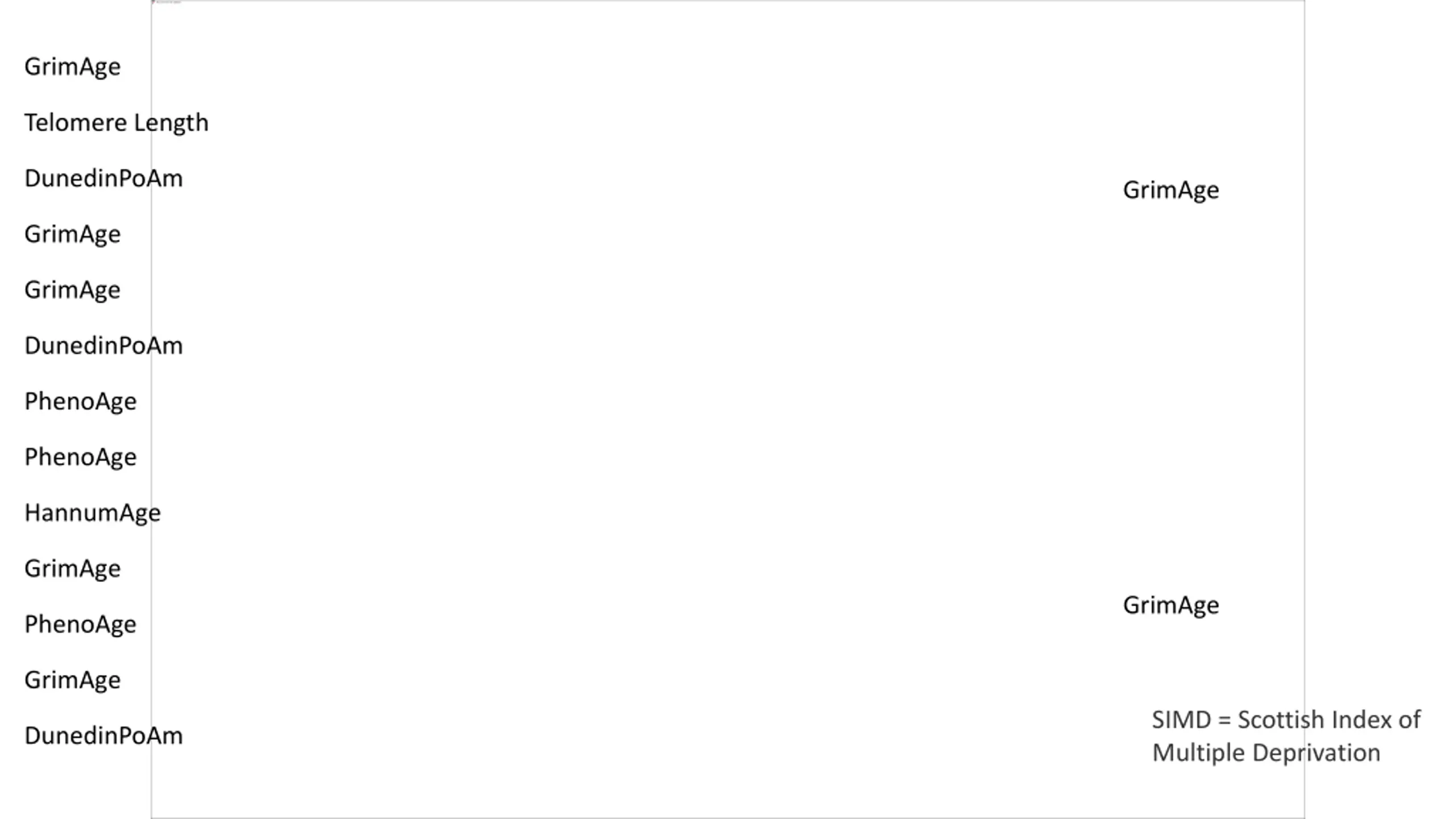 GrimAge Telomere Length DunedinPoAm GrimAge GrimAge GrimAge DunedinPoAm PhenoAge PhenoAge HannumAge GrimAge GrimAge PhenoAge GrimAge SIMD = Scottish Index of Multiple Deprivation DunedinPoAm