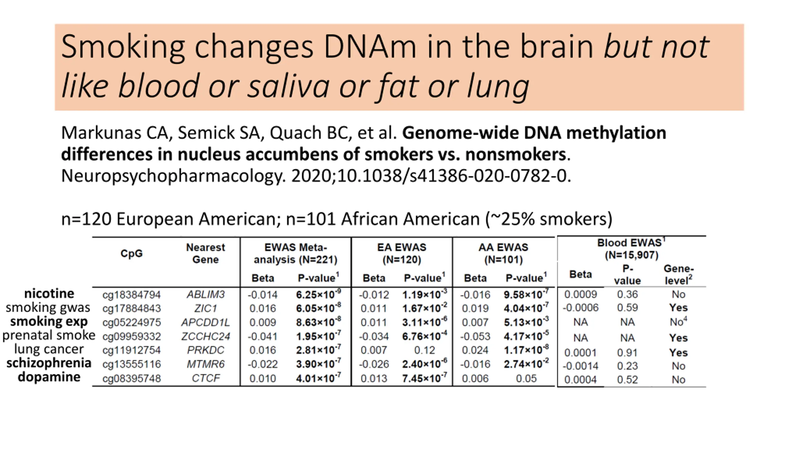 Smoking changes DNAm in the brain but not like blood or saliva or fat or lung Markunas CA, Semick SA, Quach BC, et al. Genome-wide DNA methylation differences in nucleus accumbens of smokers vs. nonsmokers. Neuropsychopharmacology. 2020;10.1038/s41386-020-0782-0. n=120 European American; n=101 African American (~25% smokers) nicotine smoking gwas smoking exp prenatal smoke lung cancer schizophrenia dopamine