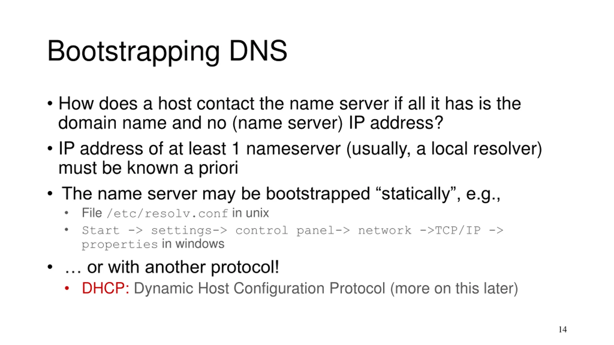 Bootstrapping DNS How does a host contact the name server if all it has is the domain name and no (name server) IP address? IP address of at least 1 nameserver (usually, a local resolver) must be known a priori The name server may be bootstrapped statically , e.g., File /etc/resolv.conf in unix Start -> settings-> control panel-> network ->TCP/IP -> properties in windows or with another protocol! DHCP: Dynamic Host Configuration Protocol (more on this later) 14