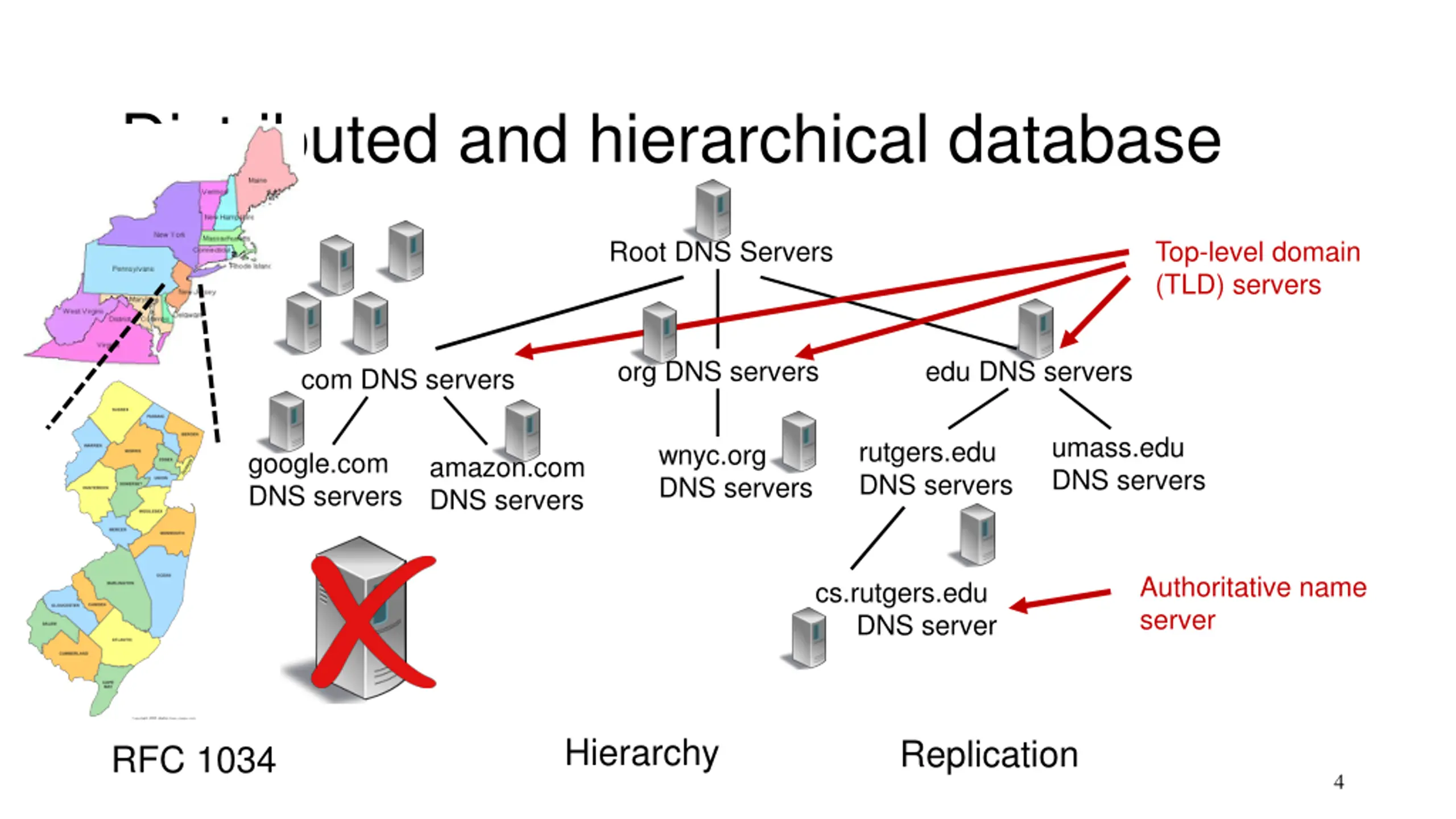 Distributed and hierarchical database Root DNS Servers Top-level domain (TLD) servers org DNS servers edu DNS servers com DNS servers umass.edu DNS servers rutgers.edu DNS servers wnyc.org DNS servers google.com DNS servers amazon.com DNS servers Authoritative name server cs.rutgers.edu DNS server Hierarchy Replication RFC 1034 4