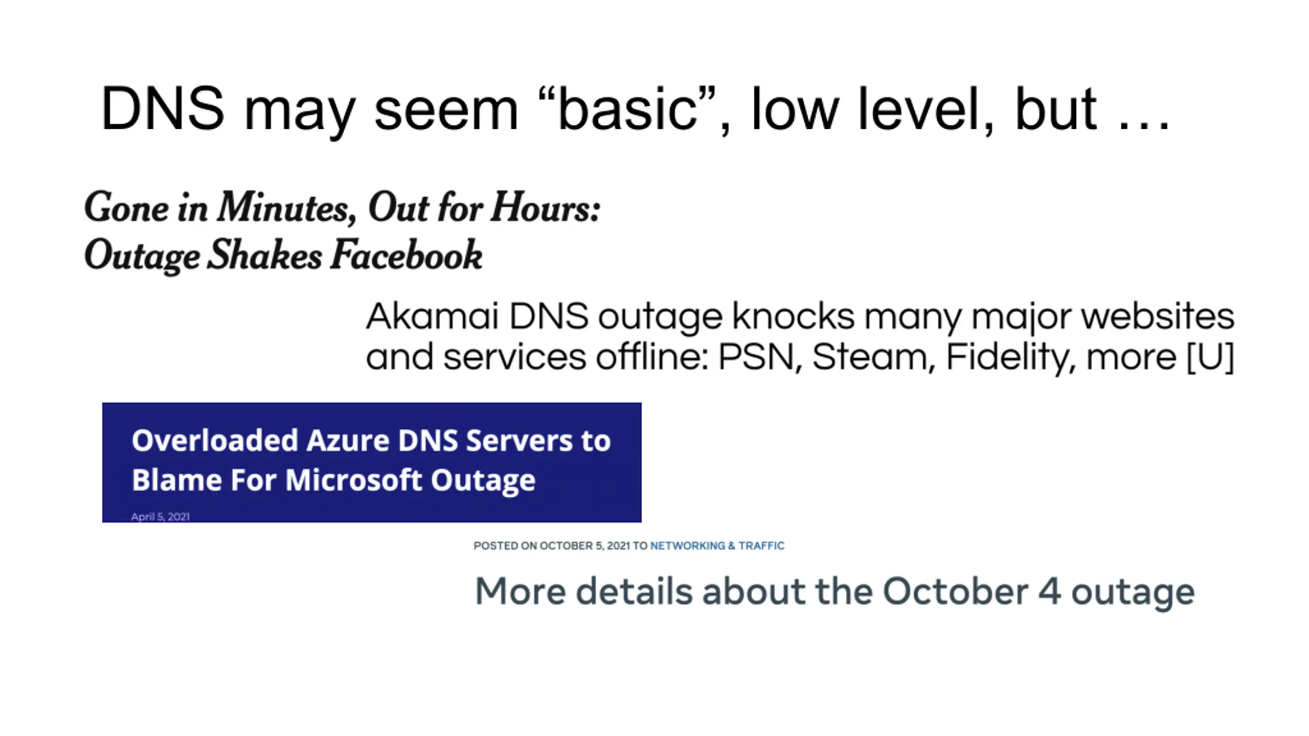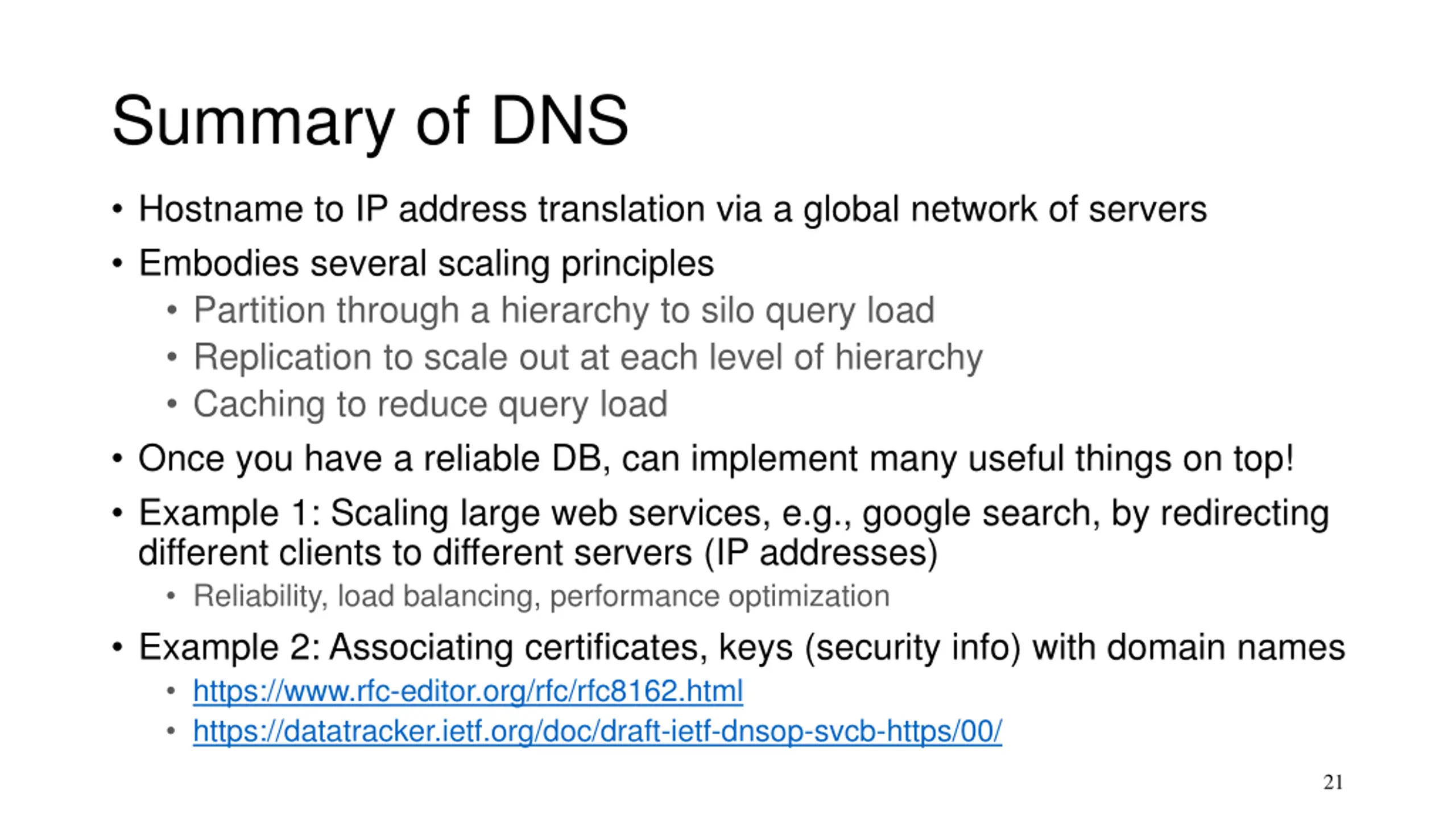 Summary of DNS Hostname to IP address translation via a global network of servers Embodies several scaling principles Partition through a hierarchy to silo query load Replication to scale out at each level of hierarchy Caching to reduce query load Once you have a reliable DB, can implement many useful things on top! Example 1: Scaling large web services, e.g., google search, by redirecting different clients to different servers (IP addresses) Reliability, load balancing, performance optimization Example 2: Associating certificates, keys (security info) with domain names https://www.rfc-editor.org/rfc/rfc8162.html https://datatracker.ietf.org/doc/draft-ietf-dnsop-svcb-https/00/ 21