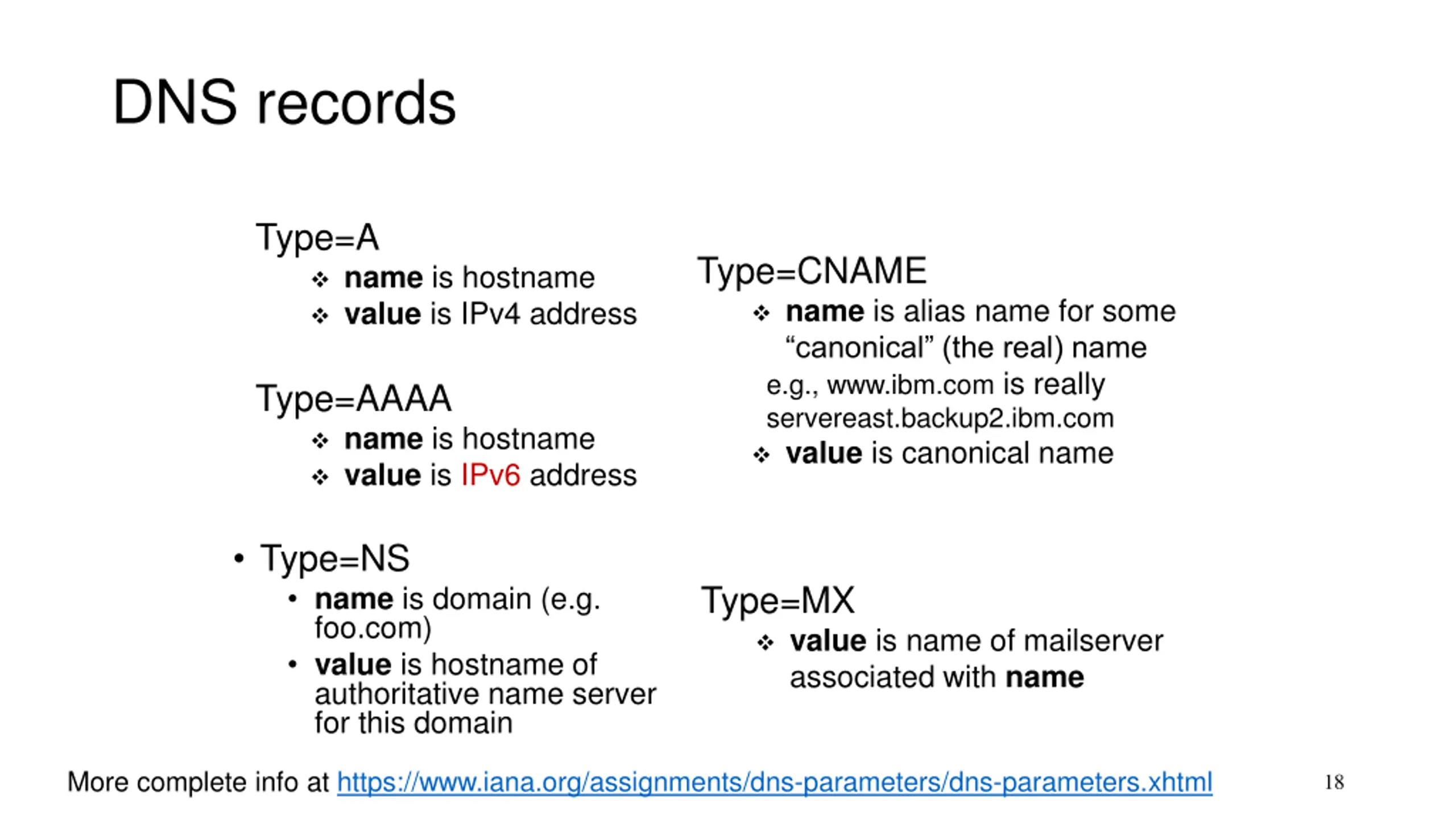 DNS records Type=A name is hostname value is IPv4 address Type=CNAME name is alias name for some canonical (the real) name e.g., www.ibm.com is really servereast.backup2.ibm.com value is canonical name Type=AAAA name is hostname value is IPv6 address Type=NS name is domain (e.g. foo.com) value is hostname of authoritative name server for this domain Type=MX value is name of mailserver associated with name More complete info at https://www.iana.org/assignments/dns-parameters/dns-parameters.xhtml 18