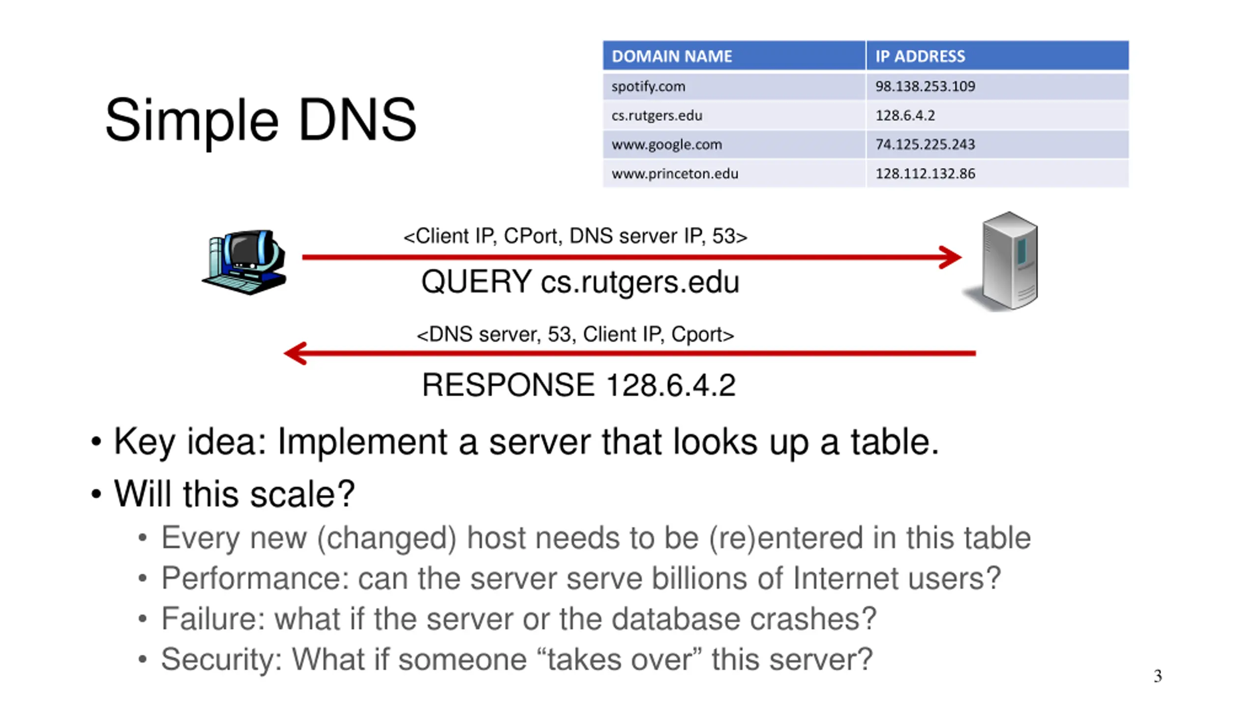 DOMAIN NAME IP ADDRESS spotify.com 98.138.253.109 Simple DNS cs.rutgers.edu 128.6.4.2 www.google.com 74.125.225.243 www.princeton.edu 128.112.132.86 <Client IP, CPort, DNS server IP, 53> QUERY cs.rutgers.edu <DNS server, 53, Client IP, Cport> RESPONSE 128.6.4.2 Key idea: Implement a server that looks up a table. Will this scale? Every new (changed) host needs to be (re)entered in this table Performance: can the server serve billions of Internet users? Failure: what if the server or the database crashes? Security: What if someone takes over this server? 3