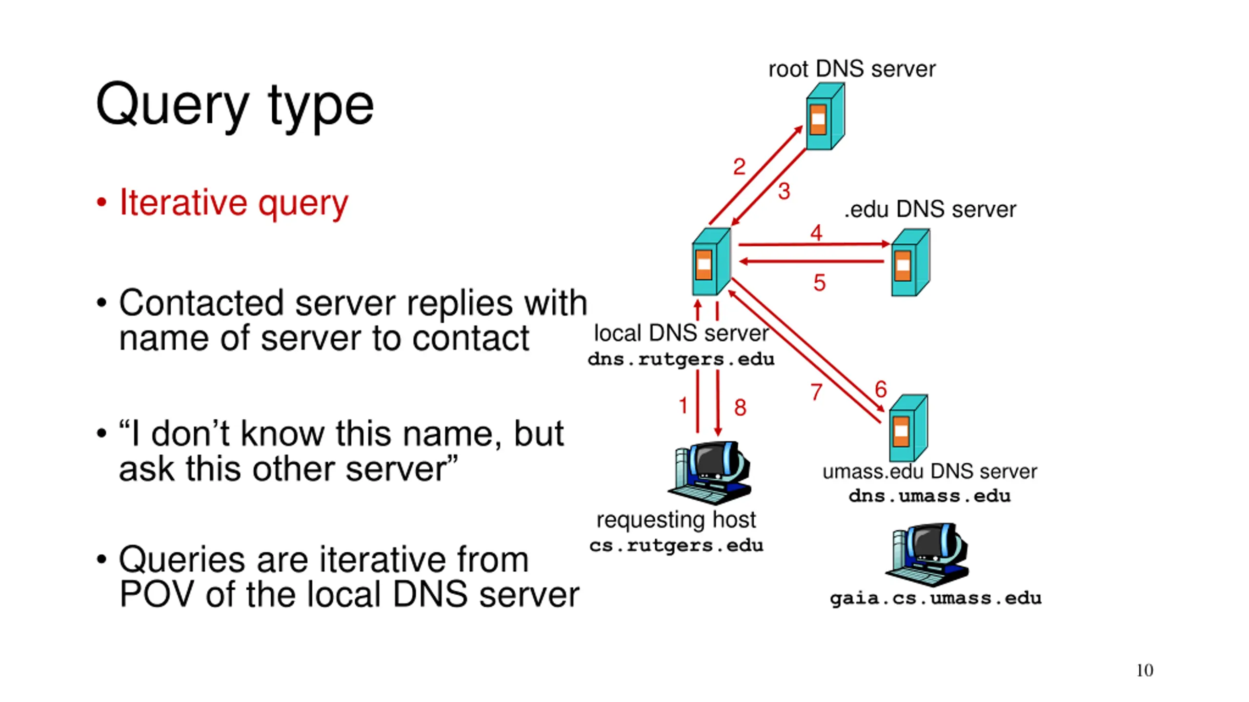 root DNS server Query type 2 3 Iterative query .edu DNS server 4 5 Contacted server replies with name of server to contact local DNS server dns.rutgers.edu 6 7 1 8 I don t know this name, but ask this other server umass.edu DNS server dns.umass.edu requesting host cs.rutgers.edu Queries are iterative from POV of the local DNS server gaia.cs.umass.edu 10