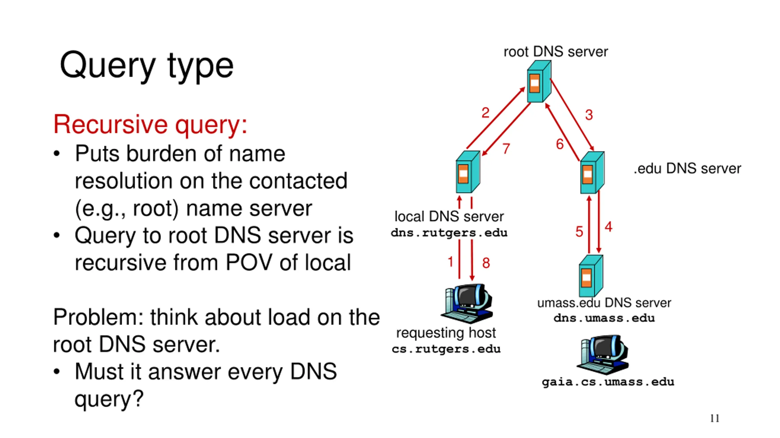 root DNS server Query type 2 3 Recursive query: Puts burden of name resolution on the contacted (e.g., root) name server Query to root DNS server is recursive from POV of local 6 7 .edu DNS server local DNS server dns.rutgers.edu 4 5 1 8 umass.edu DNS server dns.umass.edu Problem: think about load on the root DNS server. Must it answer every DNS query? requesting host cs.rutgers.edu gaia.cs.umass.edu 11