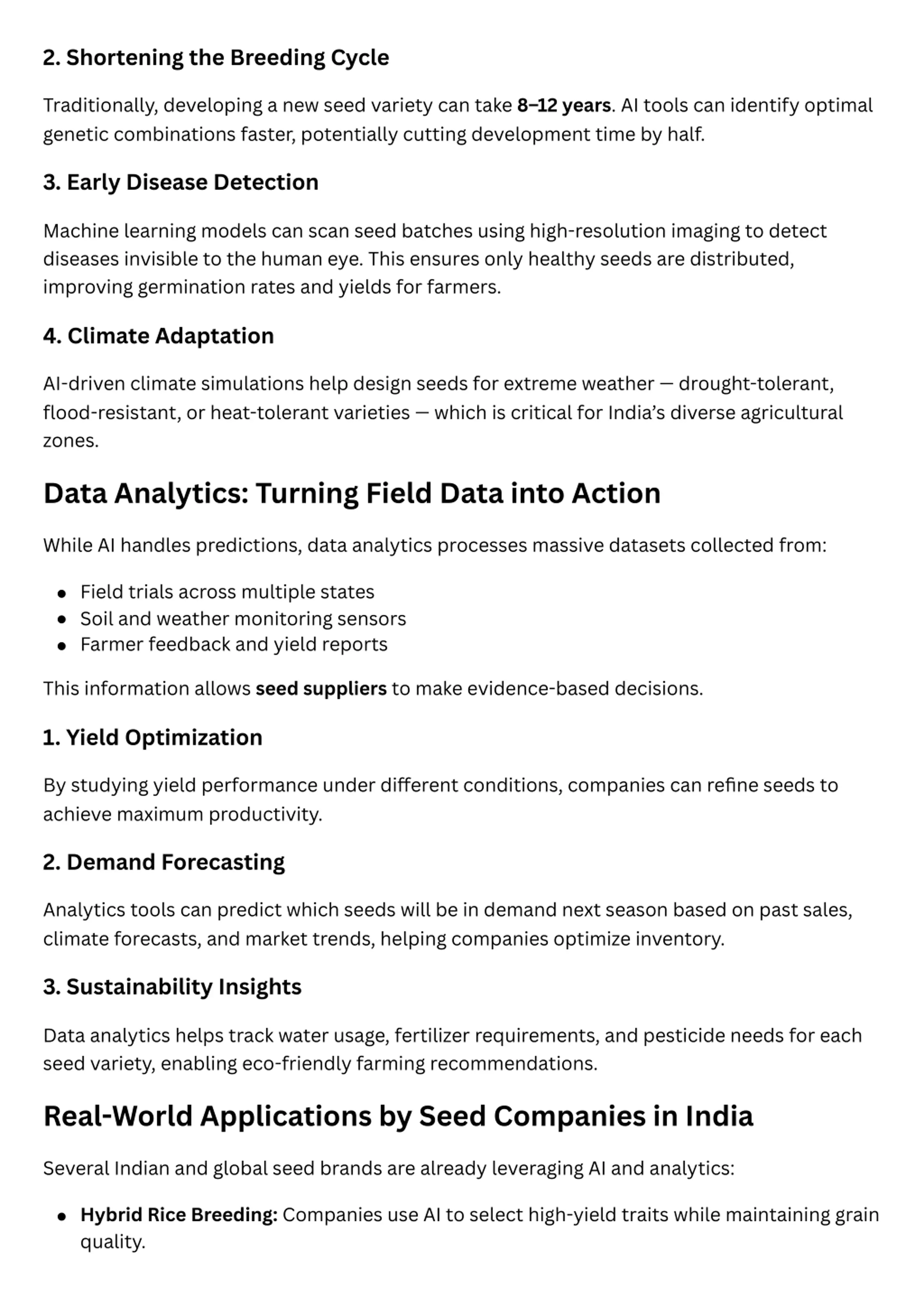 2. Shortening the Breeding Cycle Traditionally, developing a new seed variety can take 8 12 years. AI tools can identify optimal genetic combinations faster, potentially cutting development time by half. 3. Early Disease Detection Machine learning models can scan seed batches using high-resolution imaging to detect diseases invisible to the human eye. This ensures only healthy seeds are distributed, improving germination rates and yields for farmers. 4. Climate Adaptation AI-driven climate simulations help design seeds for extreme weather drought-tolerant, flood-resistant, or heat-tolerant varieties which is critical for India s diverse agricultural zones. Data Analytics: Turning Field Data into Action While AI handles predictions, data analytics processes massive datasets collected from: Field trials across multiple states Soil and weather monitoring sensors Farmer feedback and yield reports This information allows seed suppliers to make evidence-based decisions. 1. Yield Optimization By studying yield performance under different conditions, companies can refine seeds to achieve maximum productivity. 2. Demand Forecasting Analytics tools can predict which seeds will be in demand next season based on past sales, climate forecasts, and market trends, helping companies optimize inventory. 3. Sustainability Insights Data analytics helps track water usage, fertilizer requirements, and pesticide needs for each seed variety, enabling eco-friendly farming recommendations. Real-World Applications by Seed Companies in India Several Indian and global seed brands are already leveraging AI and analytics: Hybrid Rice Breeding: Companies use AI to select high-yield traits while maintaining grain quality.