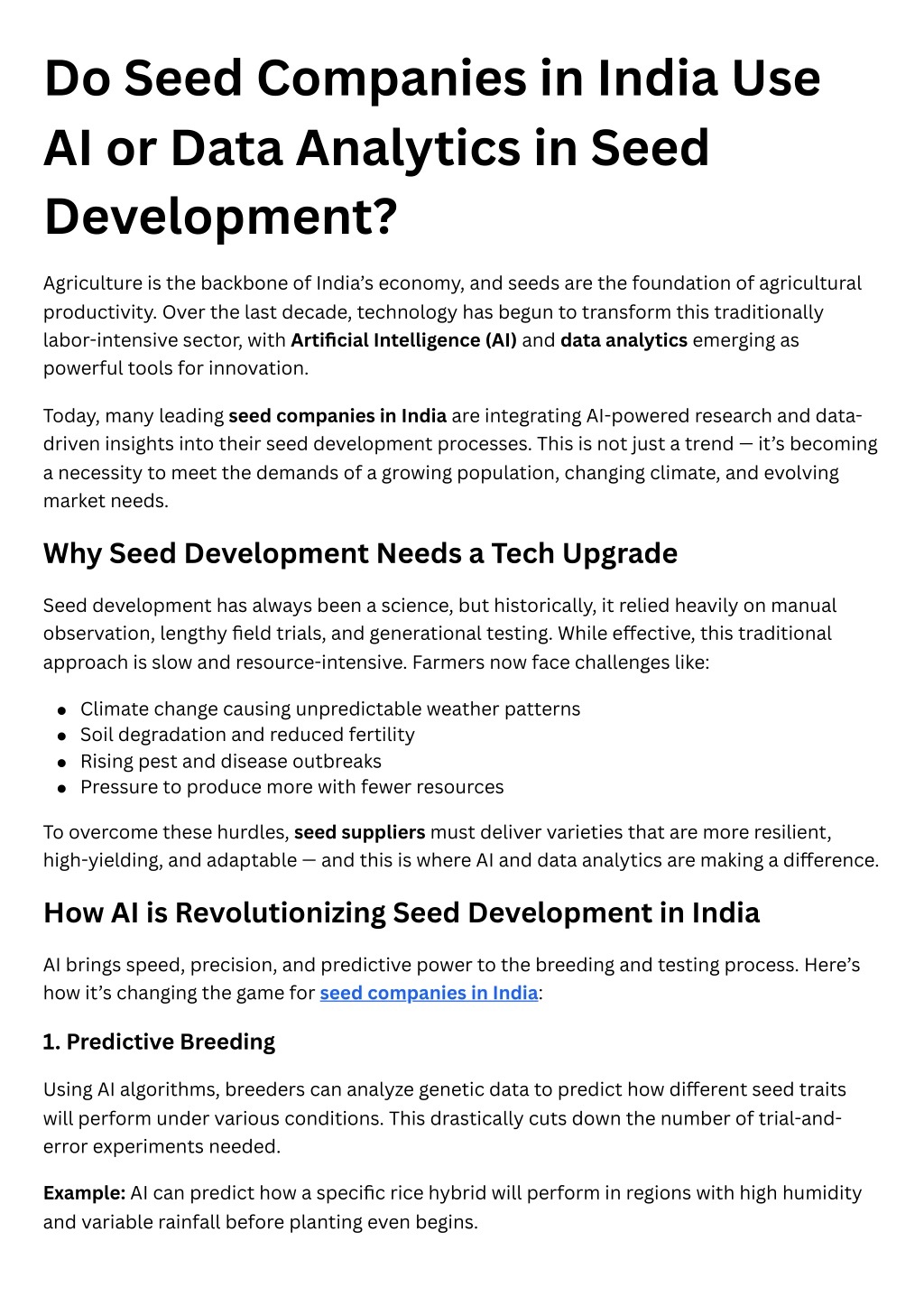 Do Seed Companies in India Use AI or Data Analytics in Seed Development? Agriculture is the backbone of India s economy, and seeds are the foundation of agricultural productivity. Over the last decade, technology has begun to transform this traditionally labor-intensive sector, with Artificial Intelligence (AI) and data analytics emerging as powerful tools for innovation. Today, many leading seed companies in India are integrating AI-powered research and data- driven insights into their seed development processes. This is not just a trend it s becoming a necessity to meet the demands of a growing population, changing climate, and evolving market needs. Why Seed Development Needs a Tech Upgrade Seed development has always been a science, but historically, it relied heavily on manual observation, lengthy field trials, and generational testing. While effective, this traditional approach is slow and resource-intensive. Farmers now face challenges like: Climate change causing unpredictable weather patterns Soil degradation and reduced fertility Rising pest and disease outbreaks Pressure to produce more with fewer resources To overcome these hurdles, seed suppliers must deliver varieties that are more resilient, high-yielding, and adaptable and this is where AI and data analytics are making a difference. How AI is Revolutionizing Seed Development in India AI brings speed, precision, and predictive power to the breeding and testing process. Here s how it s changing the game for seed companies in India: 1. Predictive Breeding Using AI algorithms, breeders can analyze genetic data to predict how different seed traits will perform under various conditions. This drastically cuts down the number of trial-and- error experiments needed. Example: AI can predict how a specific rice hybrid will perform in regions with high humidity and variable rainfall before planting even begins.