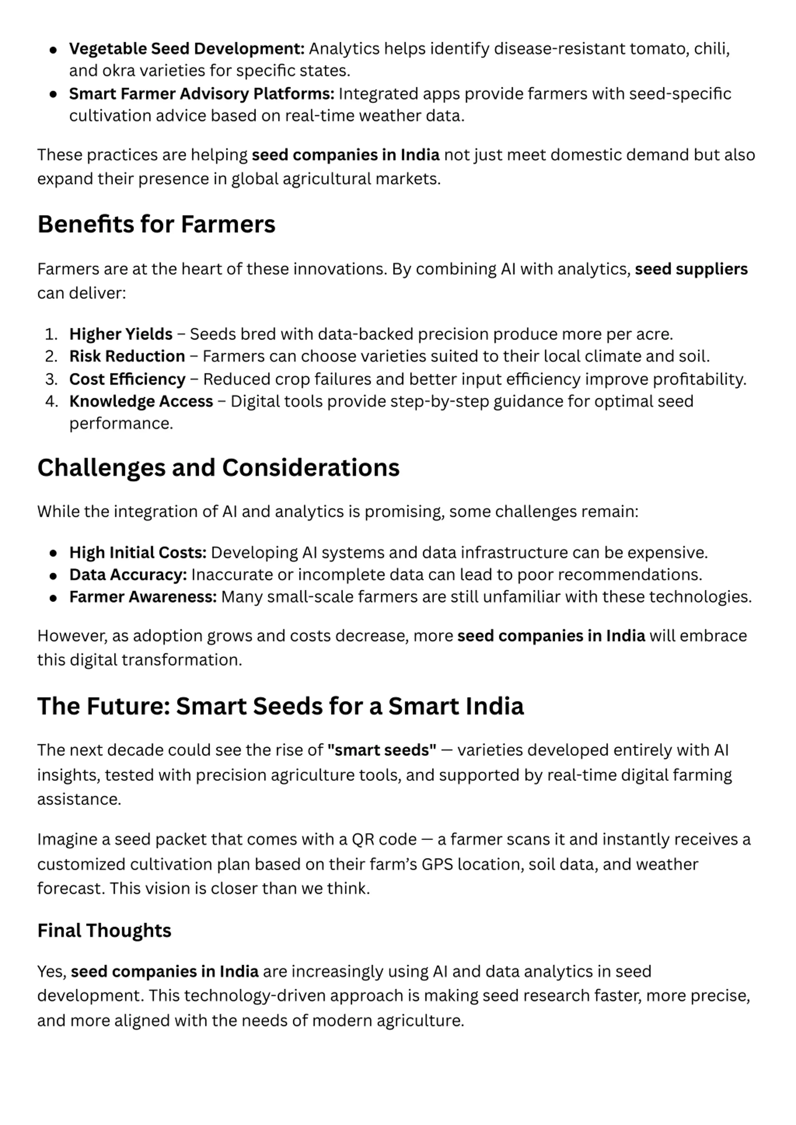 Vegetable Seed Development: Analytics helps identify disease-resistant tomato, chili, and okra varieties for specific states. Smart Farmer Advisory Platforms: Integrated apps provide farmers with seed-specific cultivation advice based on real-time weather data. These practices are helping seed companies in India not just meet domestic demand but also expand their presence in global agricultural markets. Benefits for Farmers Farmers are at the heart of these innovations. By combining AI with analytics, seed suppliers can deliver: 1. 2. 3. 4. Higher Yields Seeds bred with data-backed precision produce more per acre. Risk Reduction Farmers can choose varieties suited to their local climate and soil. Cost E?ciency Reduced crop failures and better input efficiency improve profitability. Knowledge Access Digital tools provide step-by-step guidance for optimal seed performance. Challenges and Considerations While the integration of AI and analytics is promising, some challenges remain: High Initial Costs: Developing AI systems and data infrastructure can be expensive. Data Accuracy: Inaccurate or incomplete data can lead to poor recommendations. Farmer Awareness: Many small-scale farmers are still unfamiliar with these technologies. However, as adoption grows and costs decrease, more seed companies in India will embrace this digital transformation. The Future: Smart Seeds for a Smart India The next decade could see the rise of "smart seeds" varieties developed entirely with AI insights, tested with precision agriculture tools, and supported by real-time digital farming assistance. Imagine a seed packet that comes with a QR code a farmer scans it and instantly receives a customized cultivation plan based on their farm s GPS location, soil data, and weather forecast. This vision is closer than we think. Final Thoughts Yes, seed companies in India are increasingly using AI and data analytics in seed development. This technology-driven approach is making seed research faster, more precise, and more aligned with the needs of modern agriculture.