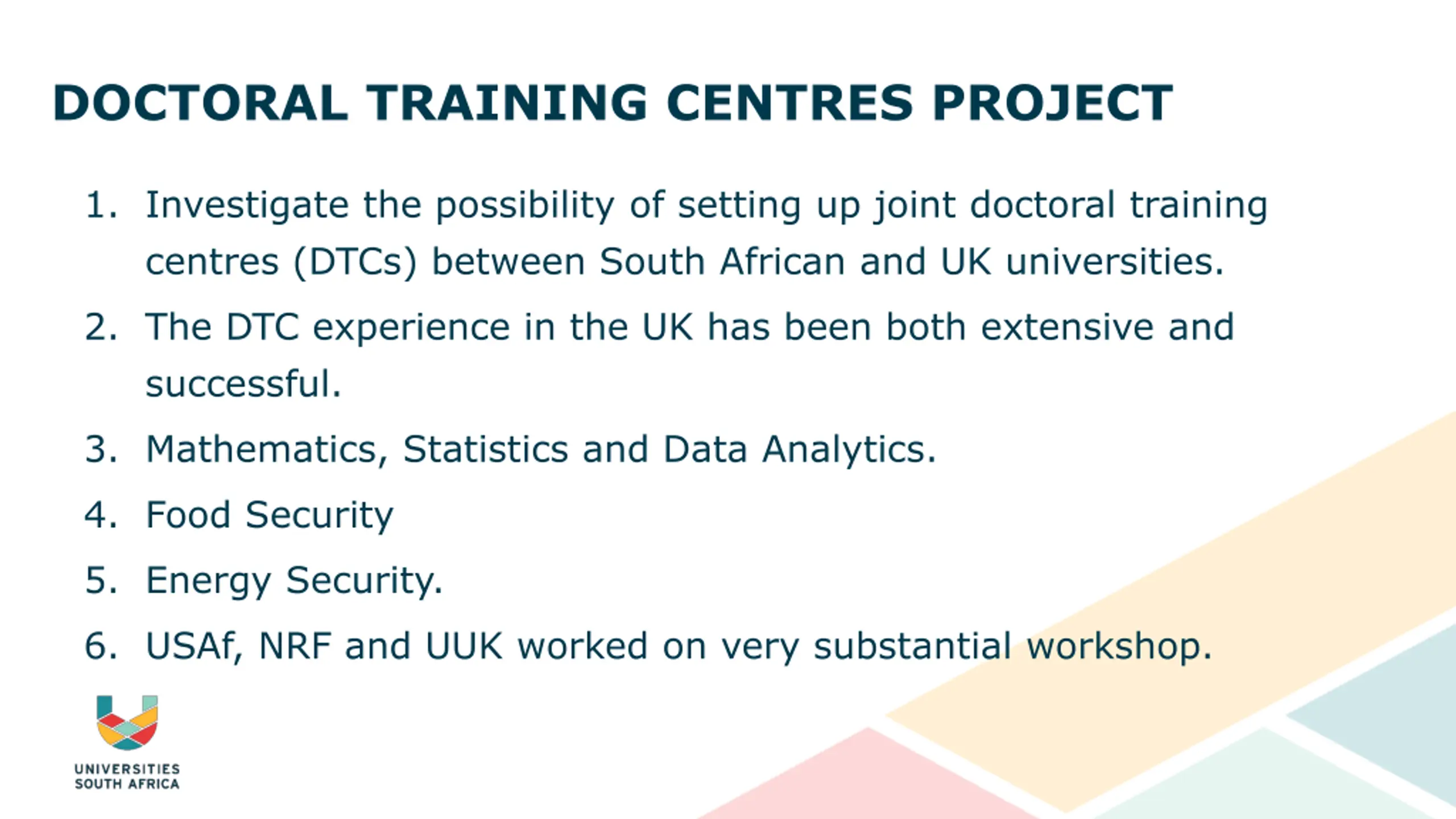 DOCTORAL TRAINING CENTRES PROJECT 1. Investigate the possibility of setting up joint doctoral training centres (DTCs) between South African and UK universities. 2. The DTC experience in the UK has been both extensive and successful. 3. Mathematics, Statistics and Data Analytics. 4. Food Security 5. Energy Security. 6. USAf, NRF and UUK worked on very substantial workshop.