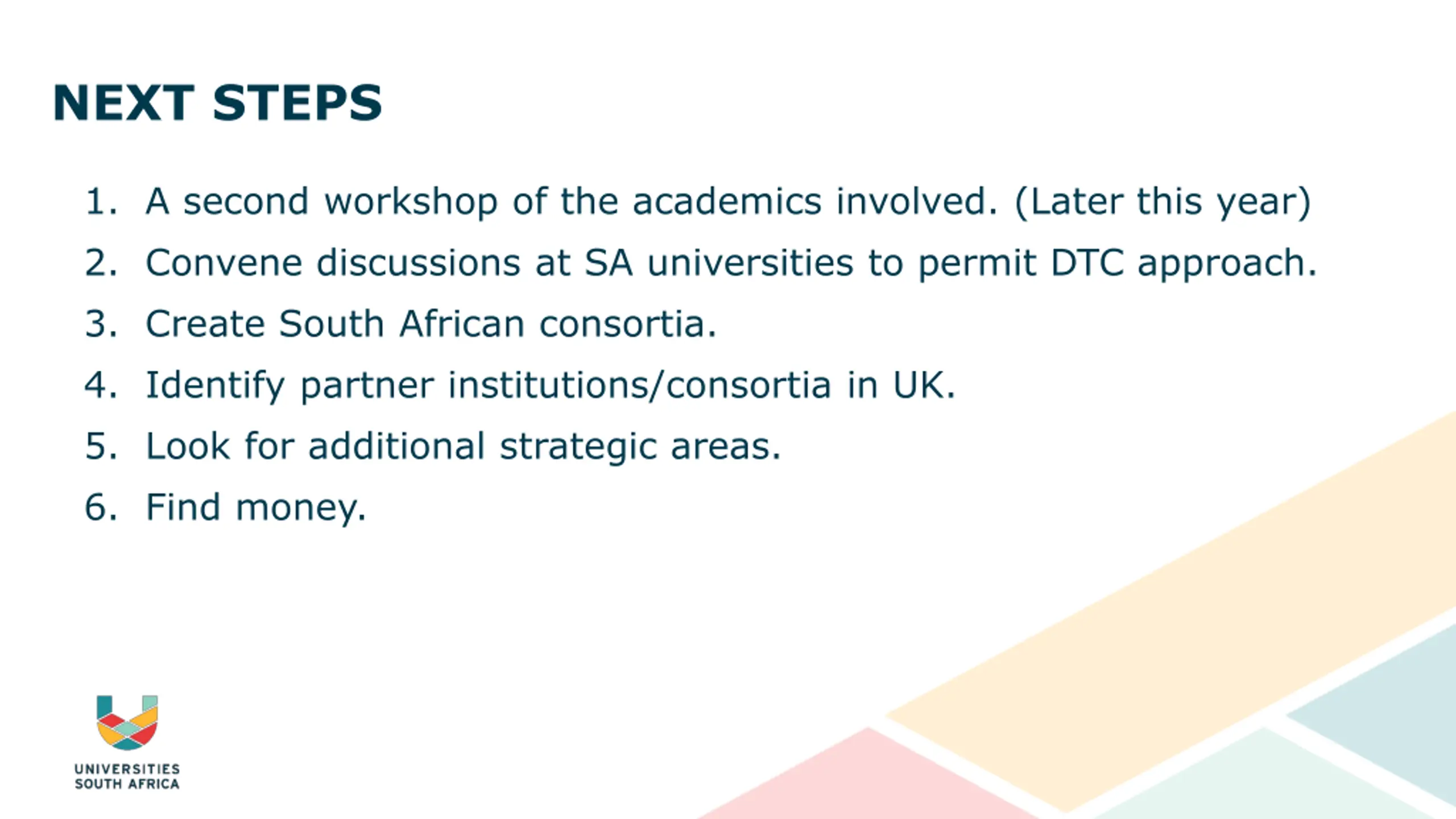 NEXT STEPS 1. A second workshop of the academics involved. (Later this year) 2. Convene discussions at SA universities to permit DTC approach. 3. Create South African consortia. 4. Identify partner institutions/consortia in UK. 5. Look for additional strategic areas. 6. Find money.
