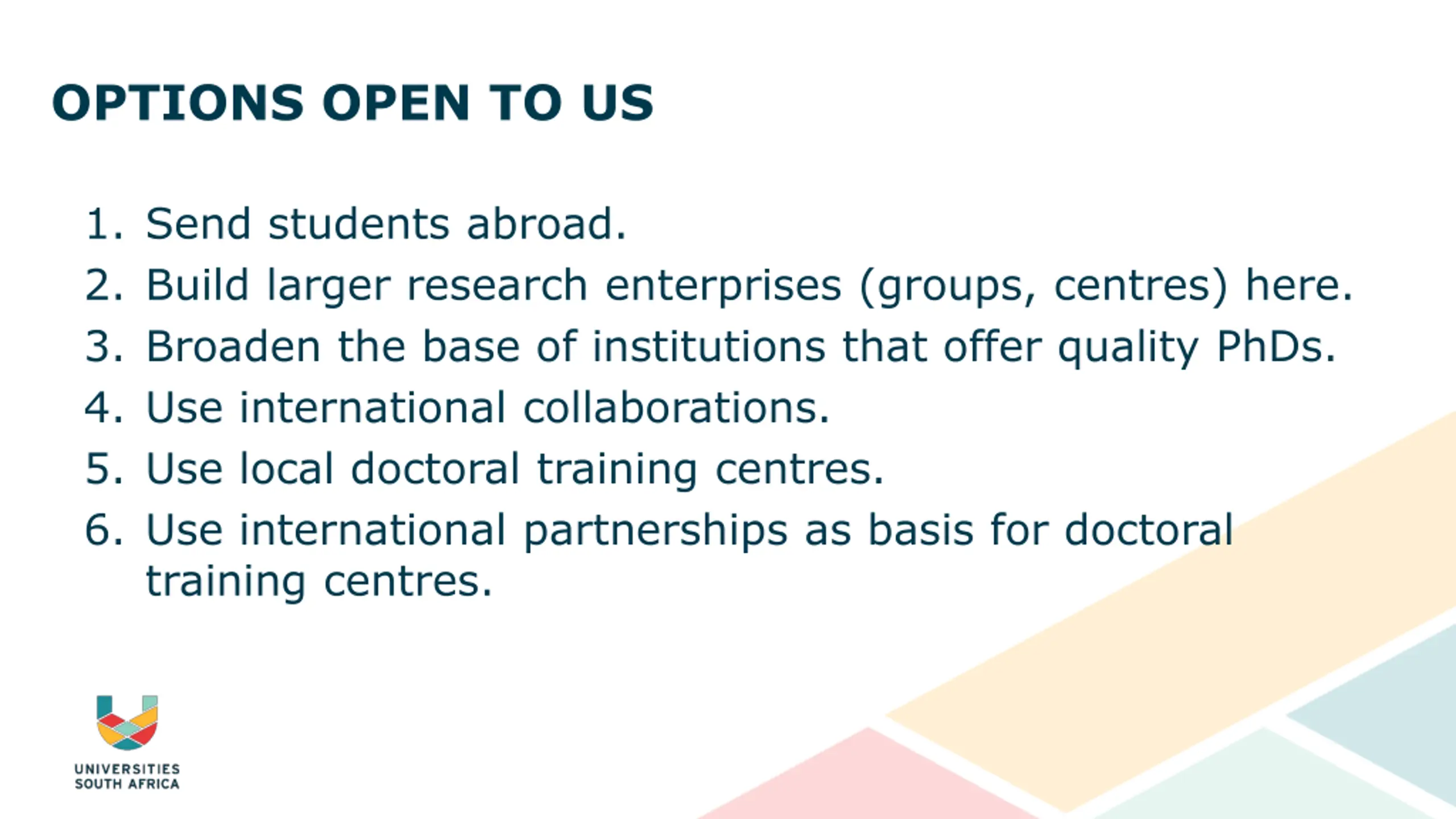 OPTIONS OPEN TO US 1. Send students abroad. 2. Build larger research enterprises (groups, centres) here. 3. Broaden the base of institutions that offer quality PhDs. 4. Use international collaborations. 5. Use local doctoral training centres. 6. Use international partnerships as basis for doctoral training centres.