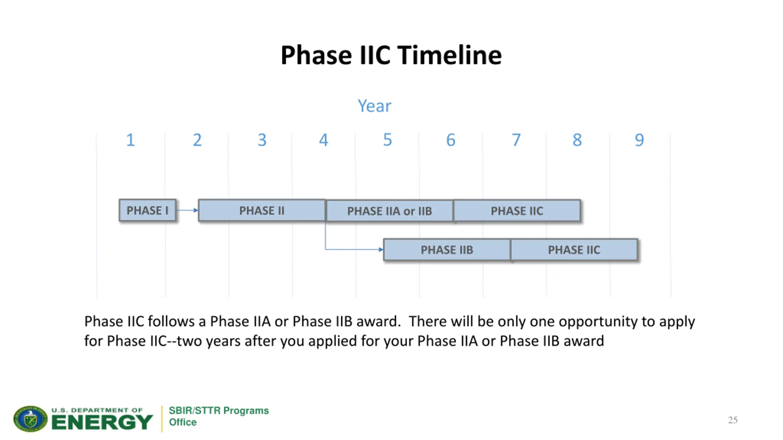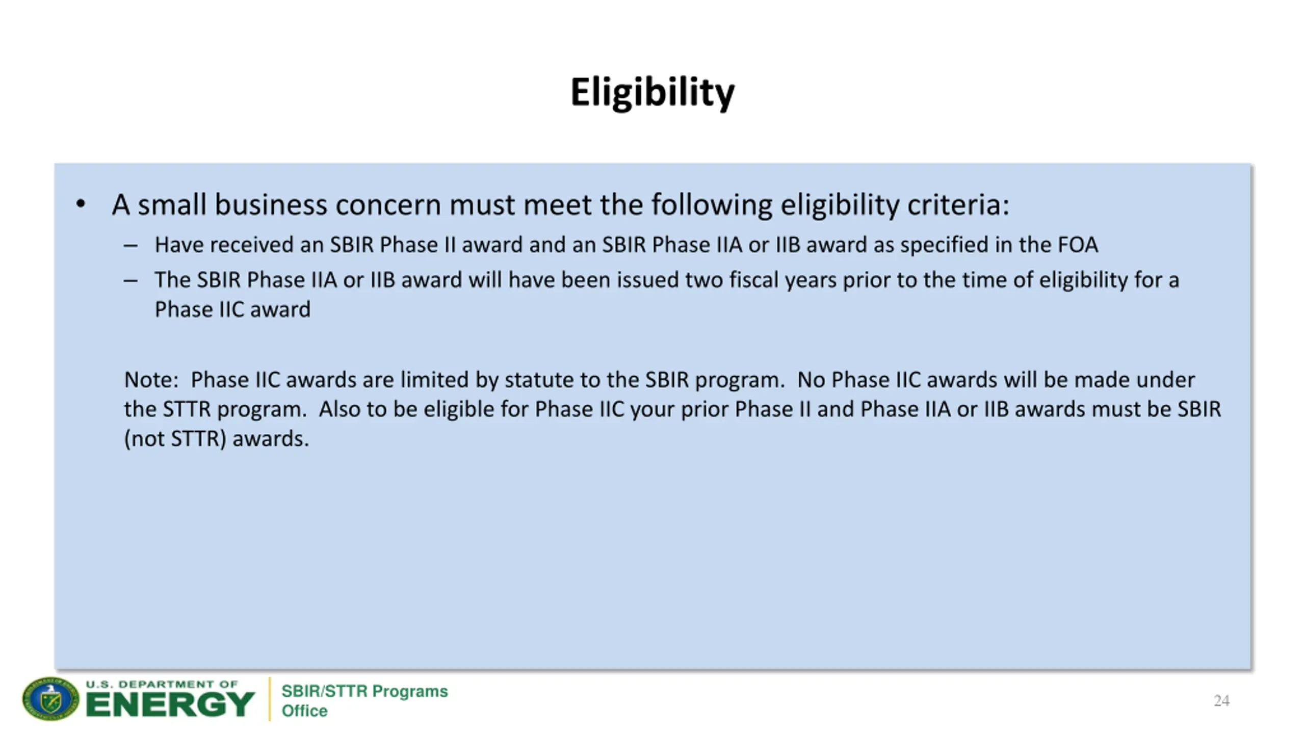 Eligibility A small business concern must meet the following eligibility criteria: Have received an SBIR Phase II award and an SBIR Phase IIA or IIB award as specified in the FOA The SBIR Phase IIA or IIB award will have been issued two fiscal years prior to the time of eligibility for a Phase IIC award Note: Phase IIC awards are limited by statute to the SBIR program. No Phase IIC awards will be made under the STTR program. Also to be eligible for Phase IIC your prior Phase II and Phase IIA or IIB awards must be SBIR (not STTR) awards. SBIR/STTR Programs Office 24