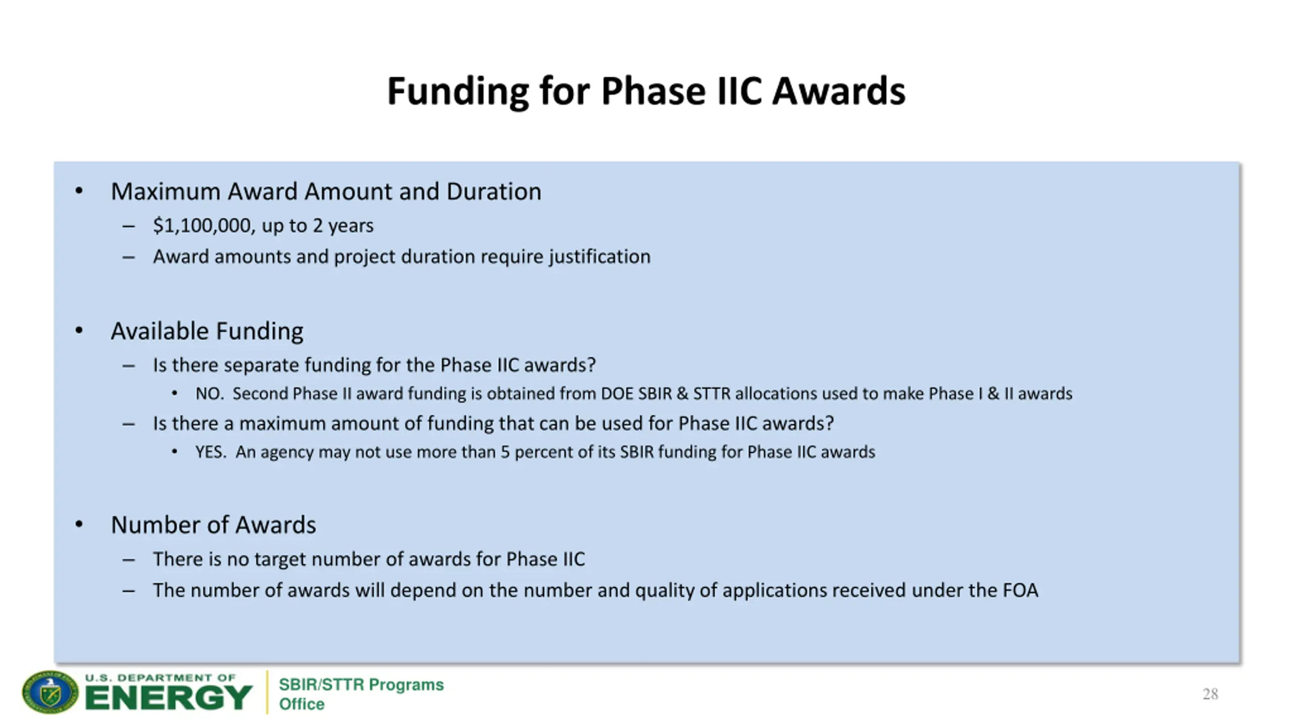 Funding for Phase IIC Awards Maximum Award Amount and Duration $1,100,000, up to 2 years Award amounts and project duration require justification Available Funding Is there separate funding for the Phase IIC awards? NO. Second Phase II award funding is obtained from DOE SBIR & STTR allocations used to make Phase I & II awards Is there a maximum amount of funding that can be used for Phase IIC awards? YES. An agency may not use more than 5 percent of its SBIR funding for Phase IIC awards Number of Awards There is no target number of awards for Phase IIC The number of awards will depend on the number and quality of applications received under the FOA SBIR/STTR Programs Office 28