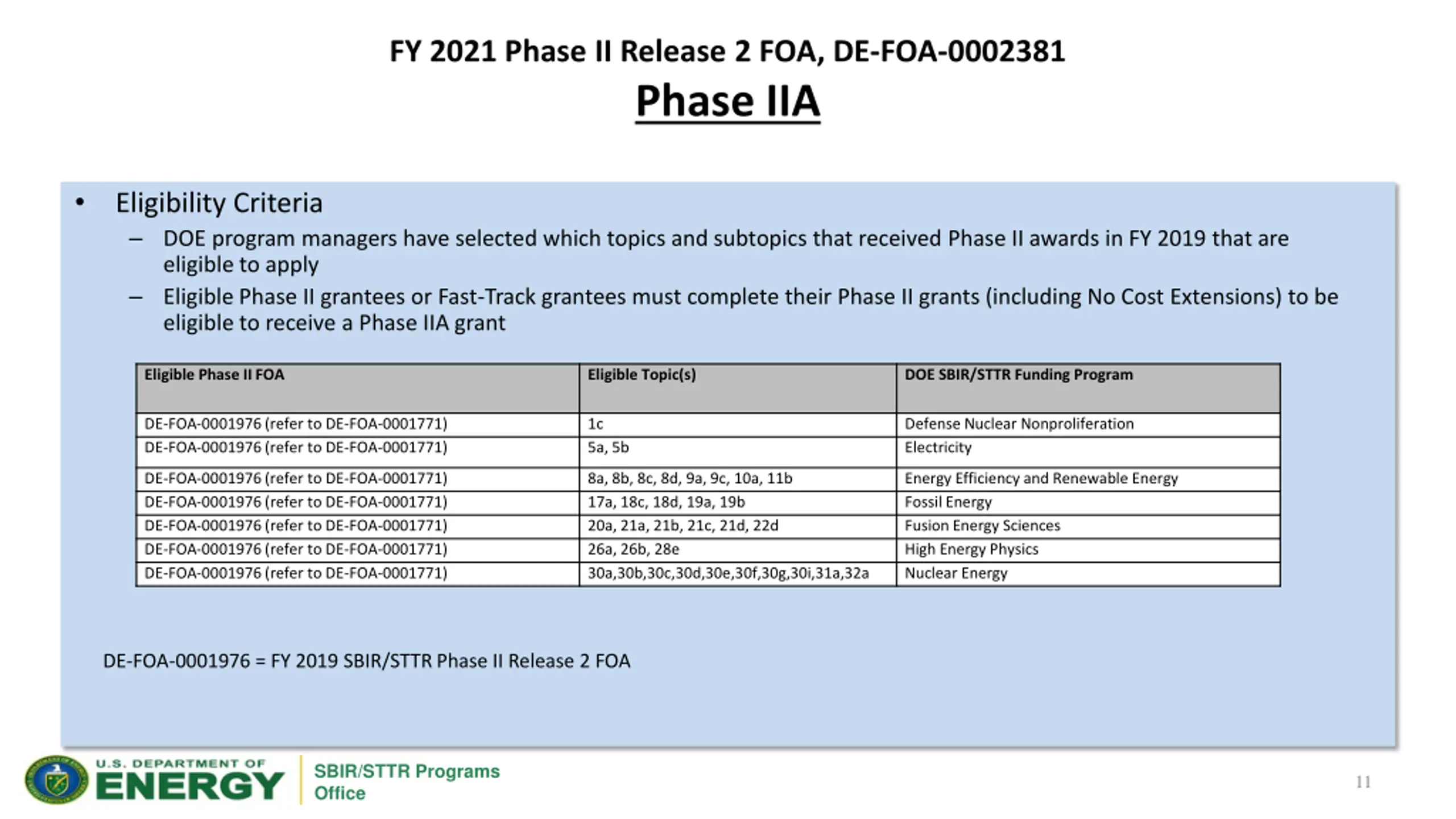 Funding for Phase IIA & IIB Awards Maximum Award Amount and Duration $1,100,000 up to 2 years Award amounts and duration require justification Available Funding Is there separate funding for Phase IIA & IIB awards? NO, second Phase II award funding is obtained from DOE SBIR & STTR allocations used to make Phase I and initial Phase II awards Number of Awards There is no target number of awards for Phase IIA or Phase IIB The number will depend on the number and quality of applications received under the FOA SBIR/STTR Programs Office 10