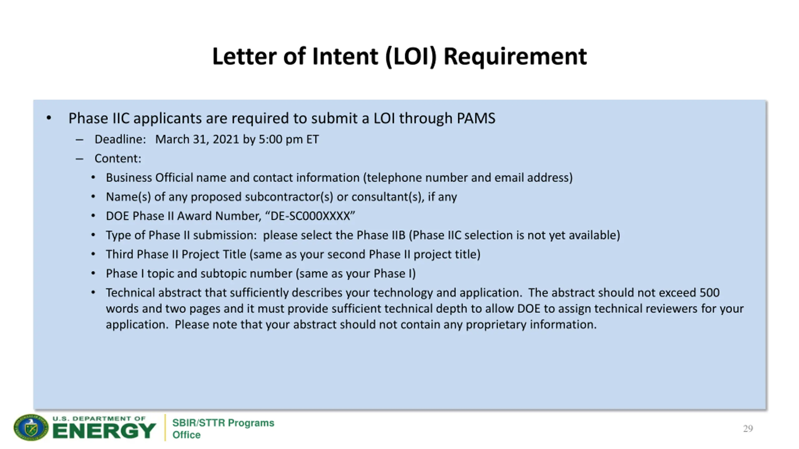 Letter of Intent (LOI) Requirement Phase IIC applicants are required to submit a LOI through PAMS Deadline: March 31, 2021 by 5:00 pm ET Content: Business Official name and contact information (telephone number and email address) Name(s) of any proposed subcontractor(s) or consultant(s), if any DOE Phase II Award Number, DE-SC000XXXX Type of Phase II submission: please select the Phase IIB (Phase IIC selection is not yet available) Third Phase II Project Title (same as your second Phase II project title) Phase I topic and subtopic number (same as your Phase I) Technical abstract that sufficiently describes your technology and application. The abstract should not exceed 500 words and two pages and it must provide sufficient technical depth to allow DOE to assign technical reviewers for your application. Please note that your abstract should not contain any proprietary information. SBIR/STTR Programs Office 29