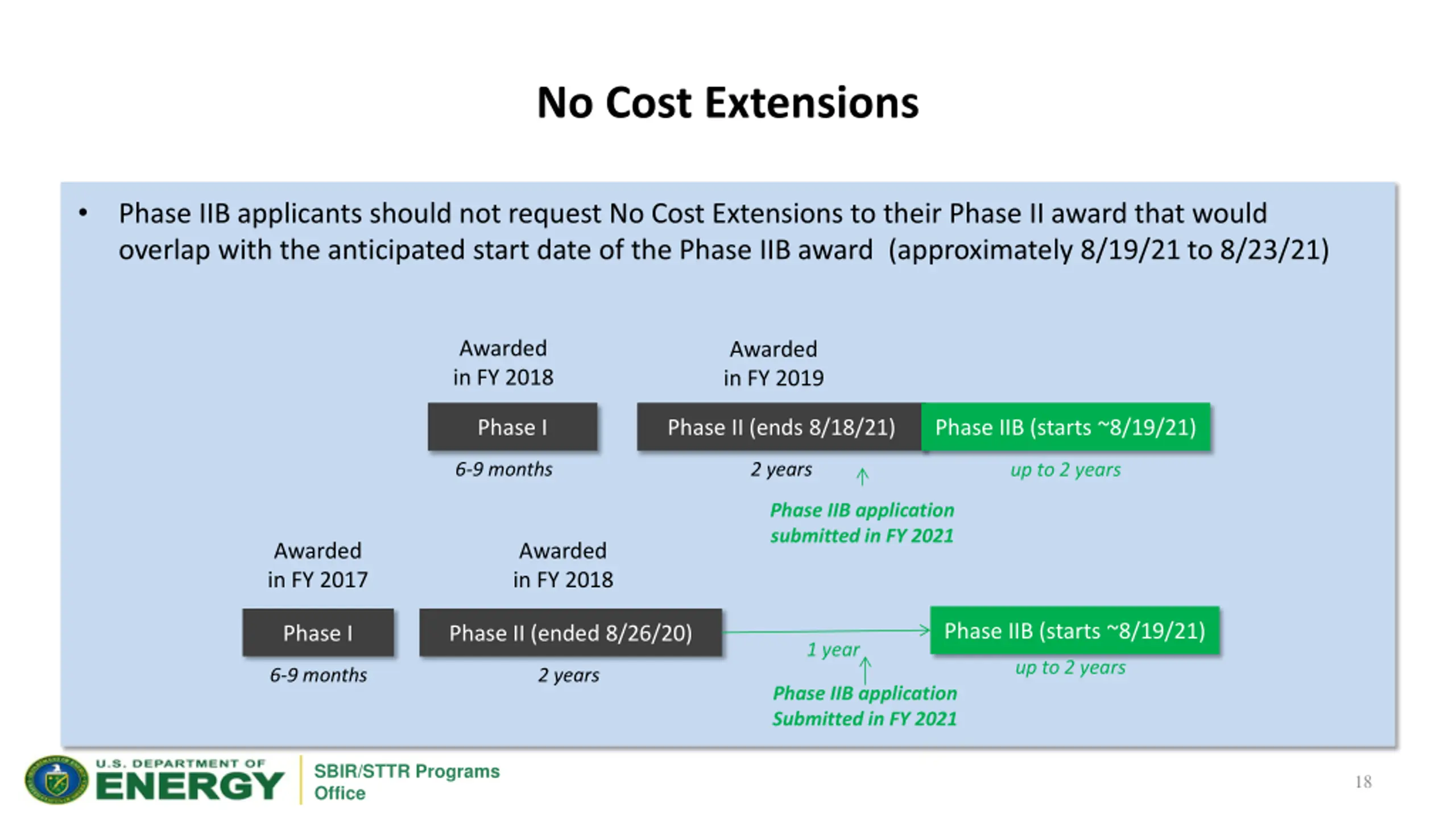 No Cost Extensions Please note that a small business is eligible to receive a Phase IIA or IIB award only if their Initial Phase II project has completed Requests for No Cost Extensions should not conflict with the Phase IIA award start date (approximately 8/19/21 to 8/23/21) Awarded in FY 2018 Awarded in FY 2019 Phase I Phase II (ends 8/18/21) Phase IIA (starts ~8/19/21) 2 years 6-9 months up to 2 years Phase IIA application submitted in FY 2021 SBIR/STTR Programs Office 17