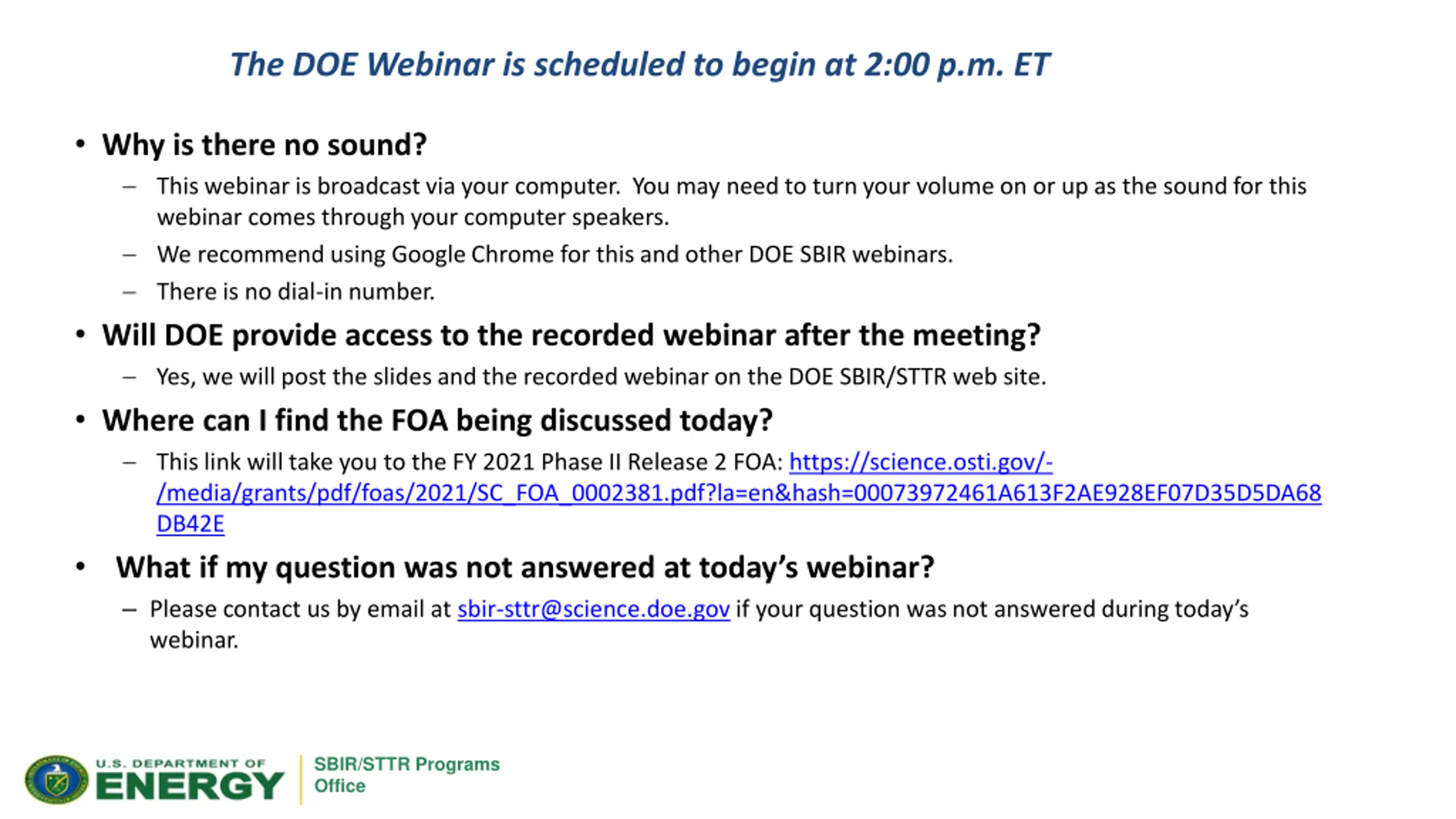 The DOE Webinar is scheduled to begin at 2:00 p.m. ET Why is there no sound? This webinar is broadcast via your computer. You may need to turn your volume on or up as the sound for this webinar comes through your computer speakers. We recommend using Google Chrome for this and other DOE SBIR webinars. There is no dial-in number. Will DOE provide access to the recorded webinar after the meeting? Yes, we will post the slides and the recorded webinar on the DOE SBIR/STTR web site. Where can I find the FOA being discussed today? This link will take you to the FY 2021 Phase II Release 2 FOA: https://science.osti.gov/- /media/grants/pdf/foas/2021/SC_FOA_0002381.pdf?la=en&hash=00073972461A613F2AE928EF07D35D5DA68 DB42E What if my question was not answered at today s webinar? Please contact us by email at sbir-sttr@science.doe.gov if your question was not answered during today s webinar. SBIR/STTR Programs Office