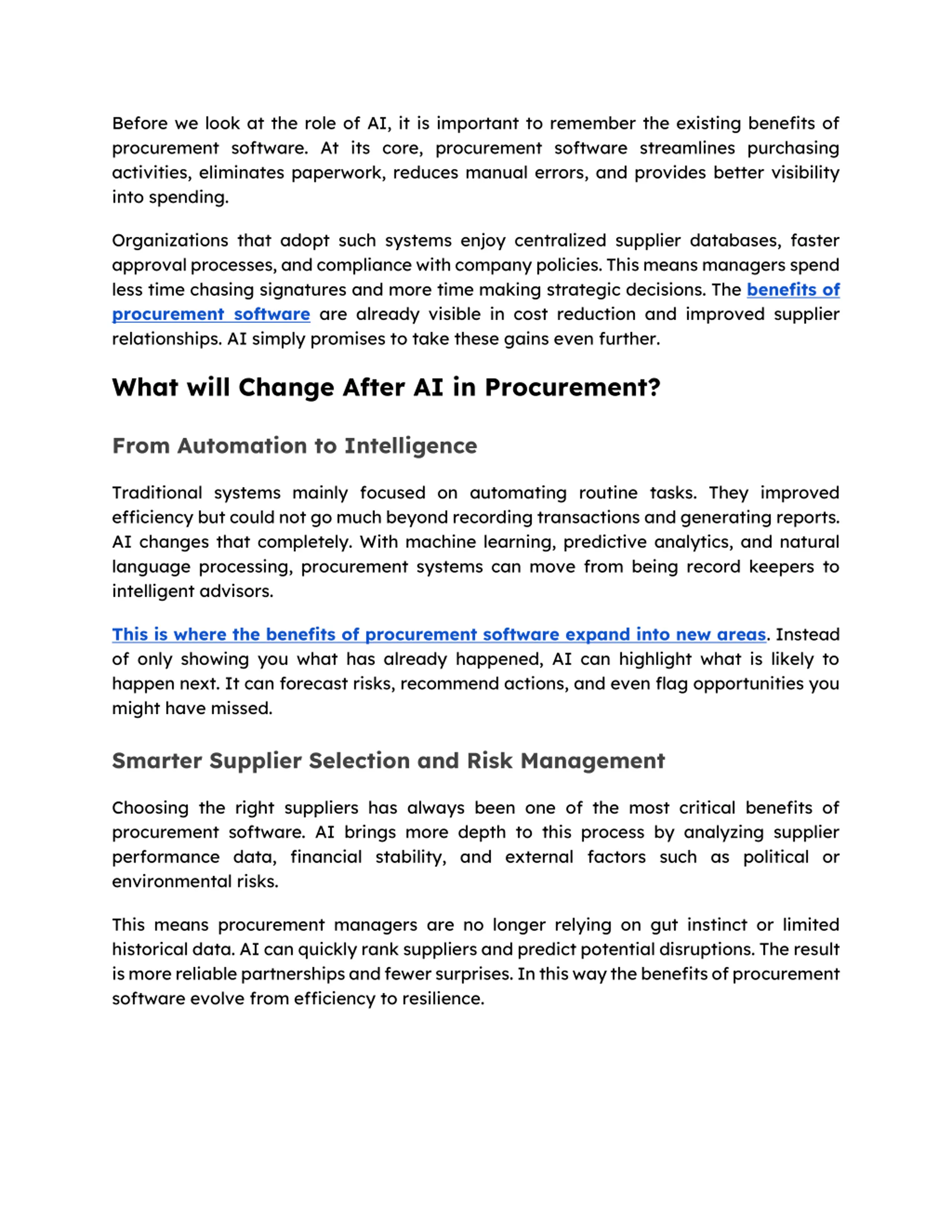 Before we look at the role of AI, it is important to remember the existing benefits of procurement software. At its core, procurement software streamlines purchasing activities, eliminates paperwork, reduces manual errors, and provides better visibility into spending. Organizations that adopt such systems enjoy centralized supplier databases, faster approval processes, and compliance with company policies. This means managers spend less time chasing signatures and more time making strategic decisions. The benefits of procurement software are already visible in cost reduction and improved supplier relationships. AI simply promises to take these gains even further. What will Change After AI in Procurement? From Automation to Intelligence Traditional systems mainly focused on automating routine tasks. They improved efficiency but could not go much beyond recording transactions and generating reports. AI changes that completely. With machine learning, predictive analytics, and natural language processing, procurement systems can move from being record keepers to intelligent advisors. This is where the benefits of procurement software expand into new areas. Instead of only showing you what has already happened, AI can highlight what is likely to happen next. It can forecast risks, recommend actions, and even flag opportunities you might have missed. Smarter Supplier Selection and Risk Management Choosing the right suppliers has always been one of the most critical benefits of procurement software. AI brings more depth to this process by analyzing supplier performance data, financial stability, and external factors such as political or environmental risks. This means procurement managers are no longer relying on gut instinct or limited historical data. AI can quickly rank suppliers and predict potential disruptions. The result is more reliable partnerships and fewer surprises. In this way the benefits of procurement software evolve from efficiency to resilience.