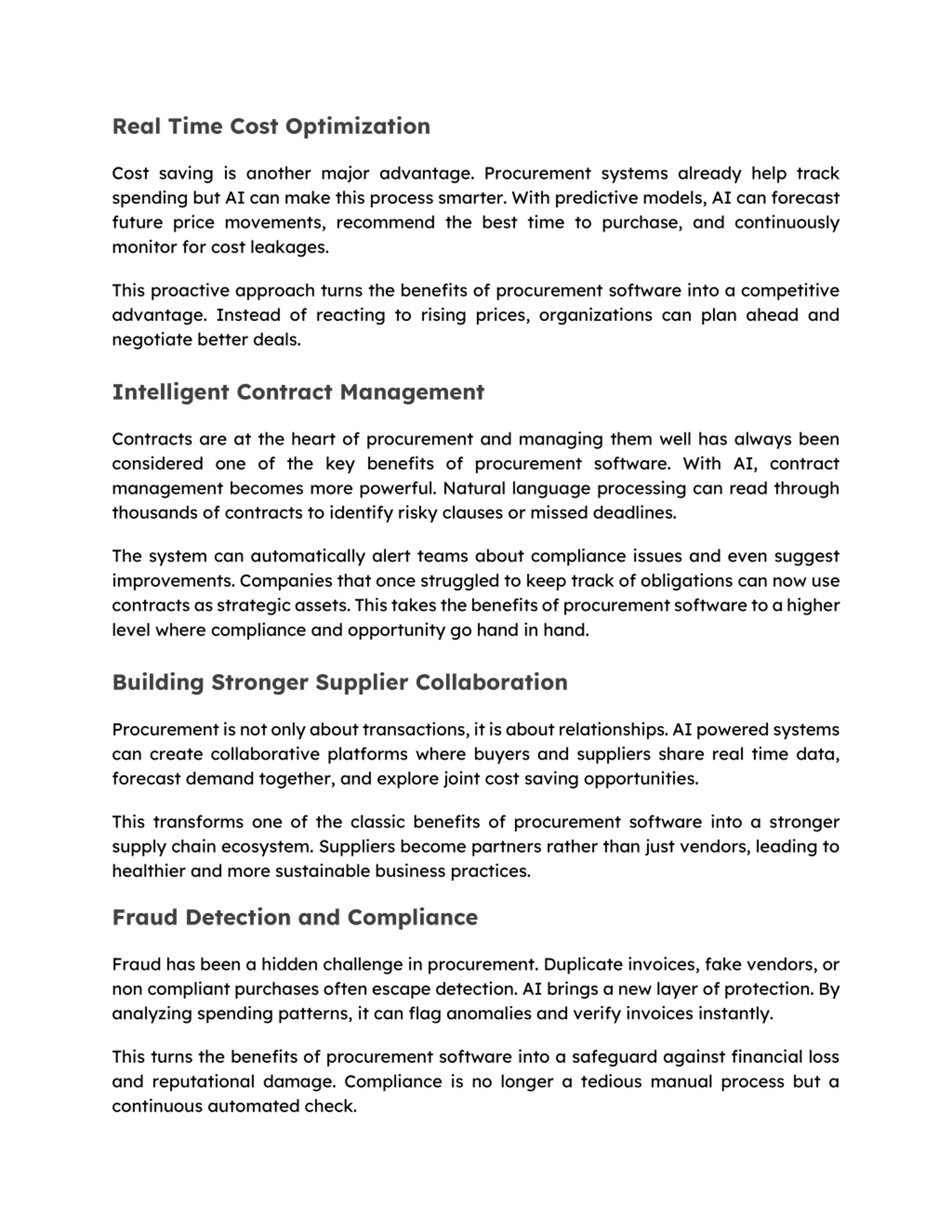 Real Time Cost Optimization Cost saving is another major advantage. Procurement systems already help track spending but AI can make this process smarter. With predictive models, AI can forecast future price movements, recommend the best time to purchase, and continuously monitor for cost leakages. This proactive approach turns the benefits of procurement software into a competitive advantage. Instead of reacting to rising prices, organizations can plan ahead and negotiate better deals. Intelligent Contract Management Contracts are at the heart of procurement and managing them well has always been considered one of the key benefits of procurement software. With AI, contract management becomes more powerful. Natural language processing can read through thousands of contracts to identify risky clauses or missed deadlines. The system can automatically alert teams about compliance issues and even suggest improvements. Companies that once struggled to keep track of obligations can now use contracts as strategic assets. This takes the benefits of procurement software to a higher level where compliance and opportunity go hand in hand. Building Stronger Supplier Collaboration Procurement is not only about transactions, it is about relationships. AI powered systems can create collaborative platforms where buyers and suppliers share real time data, forecast demand together, and explore joint cost saving opportunities. This transforms one of the classic benefits of procurement software into a stronger supply chain ecosystem. Suppliers become partners rather than just vendors, leading to healthier and more sustainable business practices. Fraud Detection and Compliance Fraud has been a hidden challenge in procurement. Duplicate invoices, fake vendors, or non compliant purchases often escape detection. AI brings a new layer of protection. By analyzing spending patterns, it can flag anomalies and verify invoices instantly. This turns the benefits of procurement software into a safeguard against financial loss and reputational damage. Compliance is no longer a tedious manual process but a continuous automated check.