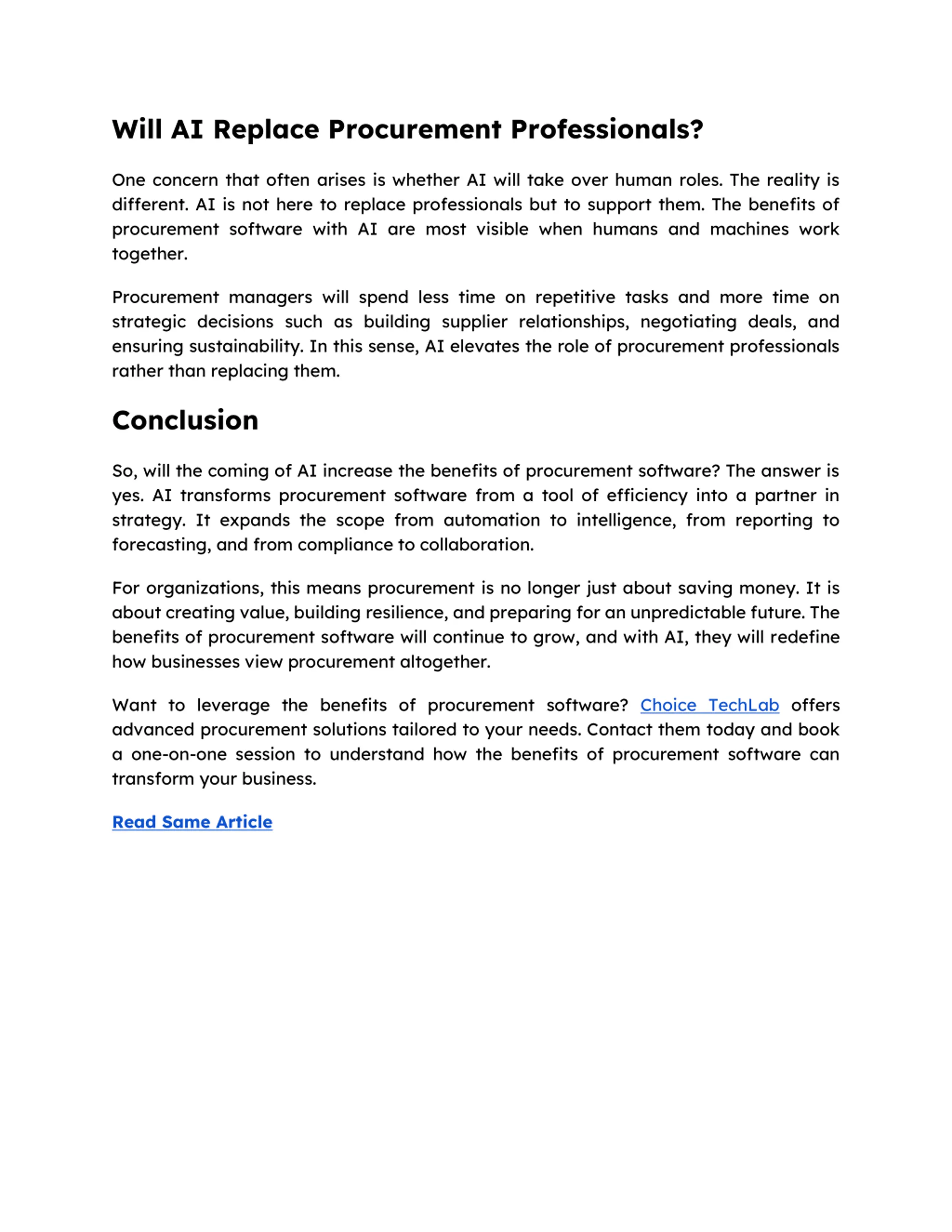 Will AI Replace Procurement Professionals? One concern that often arises is whether AI will take over human roles. The reality is different. AI is not here to replace professionals but to support them. The benefits of procurement software with AI are most visible when humans and machines work together. Procurement managers will spend less time on repetitive tasks and more time on strategic decisions such as building supplier relationships, negotiating deals, and ensuring sustainability. In this sense, AI elevates the role of procurement professionals rather than replacing them. Conclusion So, will the coming of AI increase the benefits of procurement software? The answer is yes. AI transforms procurement software from a tool of efficiency into a partner in strategy. It expands the scope from automation to intelligence, from reporting to forecasting, and from compliance to collaboration. For organizations, this means procurement is no longer just about saving money. It is about creating value, building resilience, and preparing for an unpredictable future. The benefits of procurement software will continue to grow, and with AI, they will redefine how businesses view procurement altogether. Want to leverage the benefits of procurement software? Choice TechLab offers advanced procurement solutions tailored to your needs. Contact them today and book a one-on-one session to understand how the benefits of procurement software can transform your business. Read Same Article